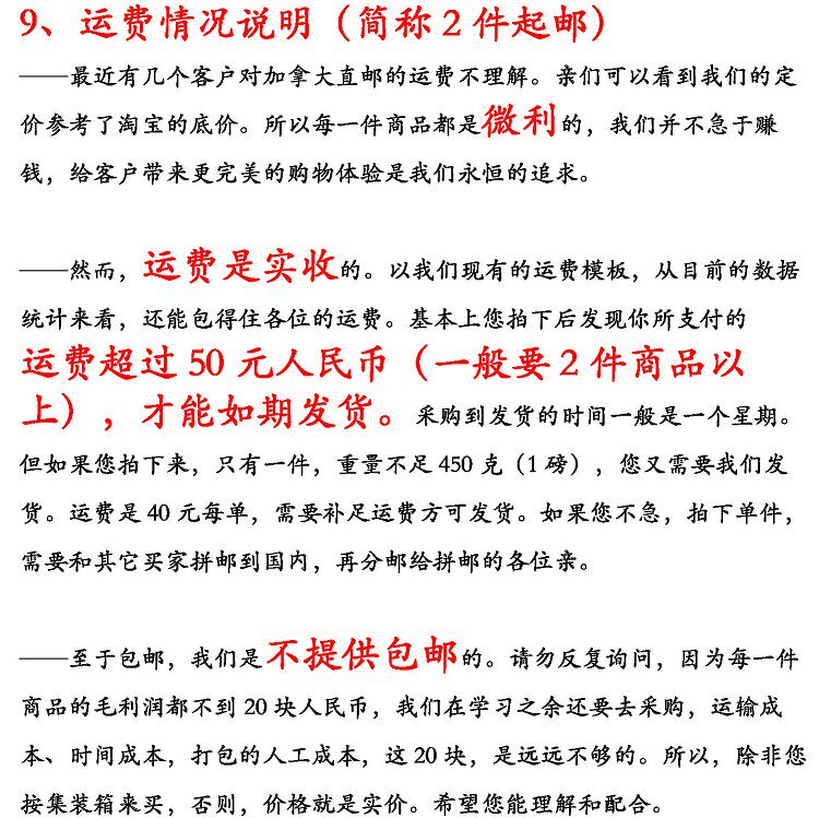 Недавно несколько клиентов не понимали груз канадской прямой почтовой почты.Я опубликую наши две кооперативные экспресс -информацию.Наше ценообразование относится к базовой цене Taobao.Каждая из наших продуктов немного прибыльна. Мы не спешаем зарабатывать деньги. Предоставить более совершенные покупки для клиентов - это ценности, которые мы всегда преследовали.
