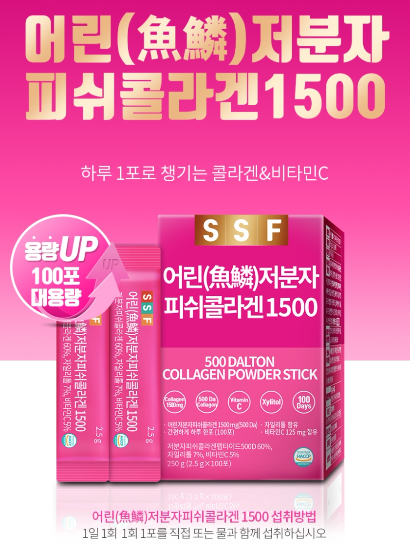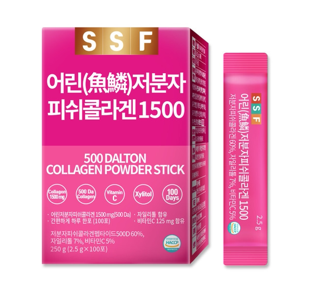 Корейская шкала рыб SSF Маленькая молекула 500DA Fish Collagen 1500 Dimension C Порошковое йогуртное аромат 2,5 г*100 коробок с пакетами