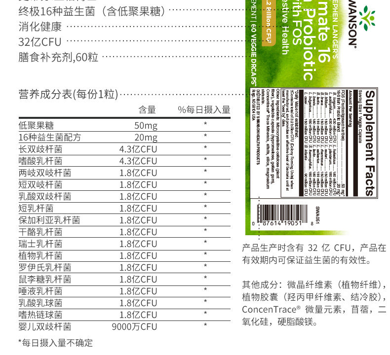 Десять миллиардов Swanson Swansen 16 активированные пробиотические капсулы 60 капсул из 3,2 миллиарда пробиотиков.