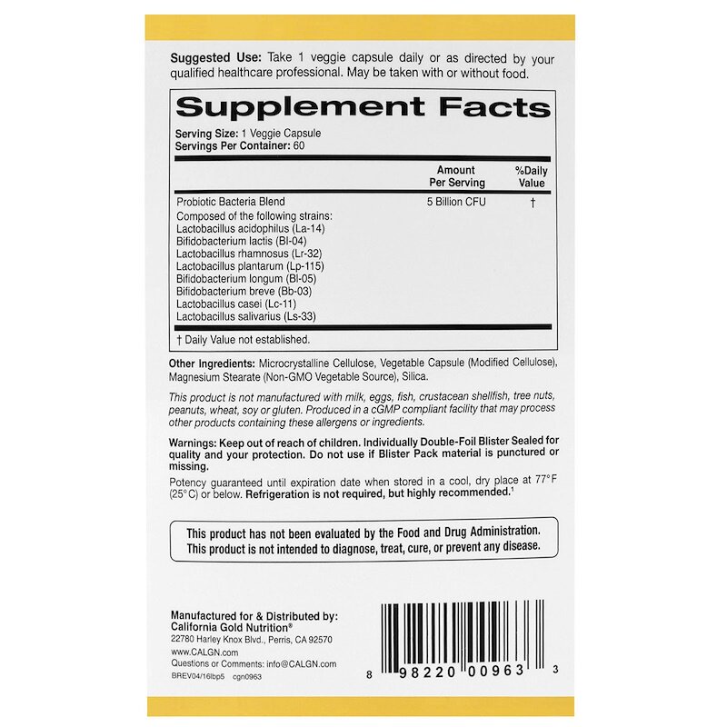 California Gold Nutrition Пробиотик Lactobacillus bifurcatum 5 миллиардов бактерий 60 вегетарианских капсул