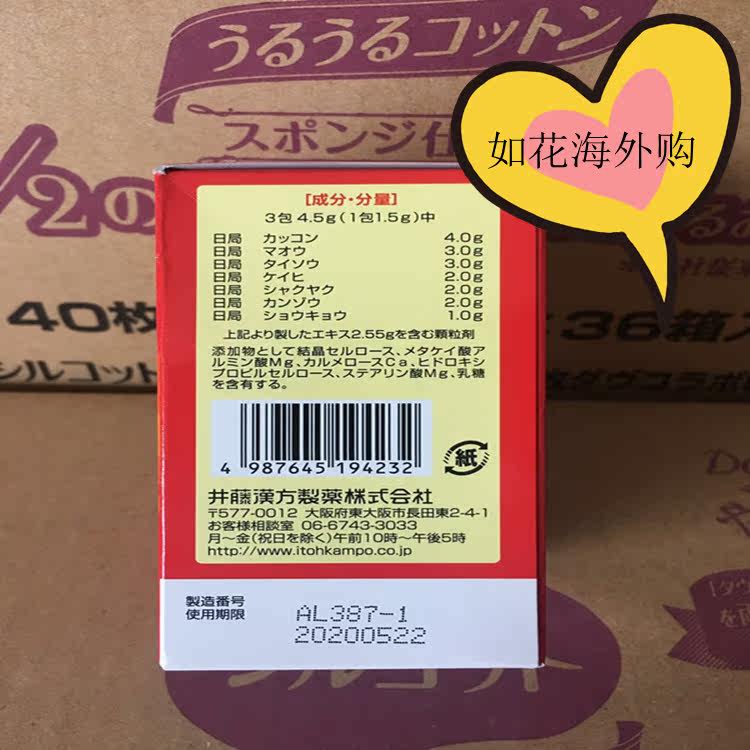 | Меры предосторожности: | 1. запрещено принимать его до 2 лет 2. Когда дети берут, пожалуйста, возьмите это под руководством и надзором The Guardian 3. Пожалуйста, сохраните его в прохладном и сухом месте, где дети не могут коснуться 4, 1 пакет принимается снова и снова. 5. Продукт использует лекарство, поэтому частицы продукта могут иметь разницу в цвете, но оно не влияет на его функции и эффекты. | ||||