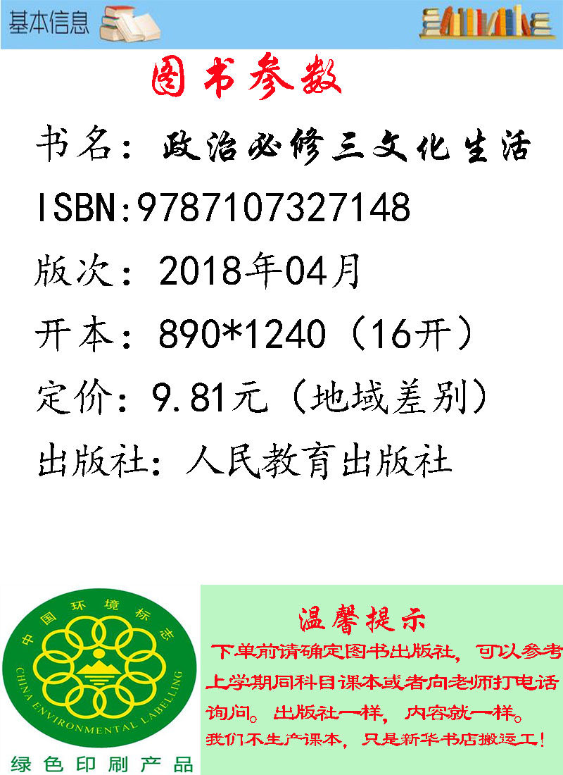(Пересмотрено после 19 -го национального конгресса Коммунистической партии Китая) Народное образование Издание идеологическая политика Обязательная 3 Культурная книга учебника Учебник из публикации идеологическая политика Обязательная трех культурная жизнь средняя школа политические основы 3 культурные жизни