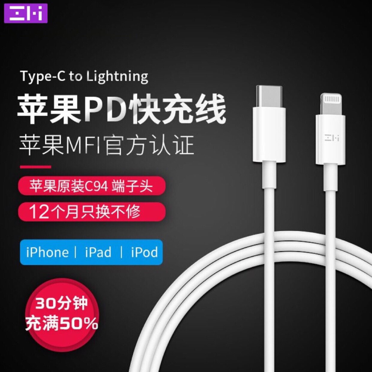 Кабель для быстрой зарядки Zimi Apple PD, сертифицированный Apple MFI, использует терминальный чип C94, поддерживает быструю зарядку PD для моделей Apple 8 и выше.