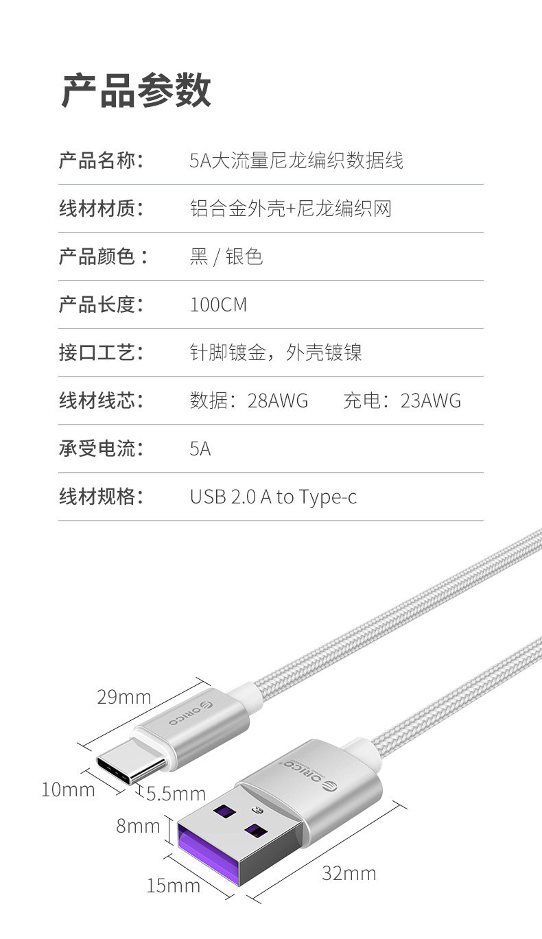 Кабель данных Orico/Orre-C 5A Super Fast Carging Anwan Зарядная зарядная кабель подходит для Huawei, применимого к P9P10P20P30PRO Honor V9V10 Xiaomi 5x Fast Charge Cable