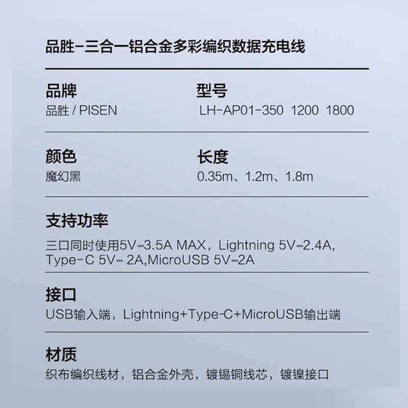 品胜 Apple, металлический плетеный совместимый зарядный кабель, универсальный мобильный телефон, «три в одном», алюминиевый сплав, андроид