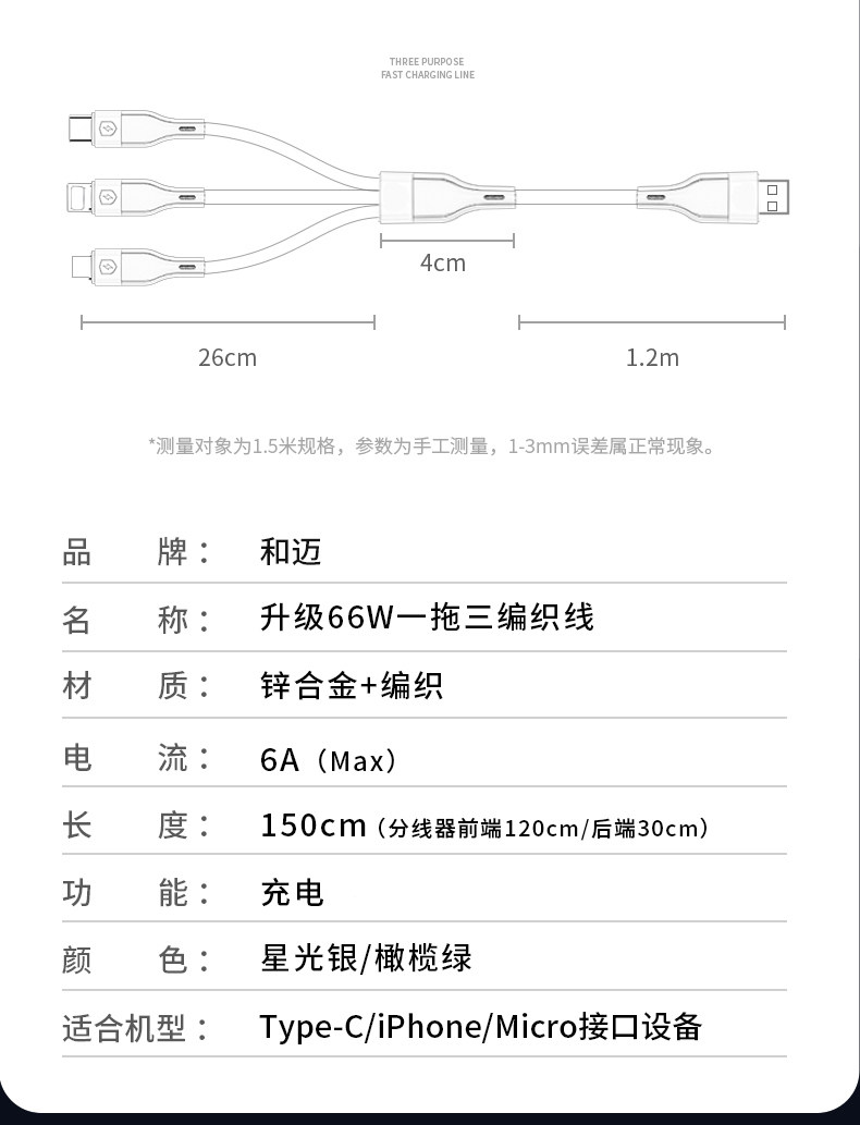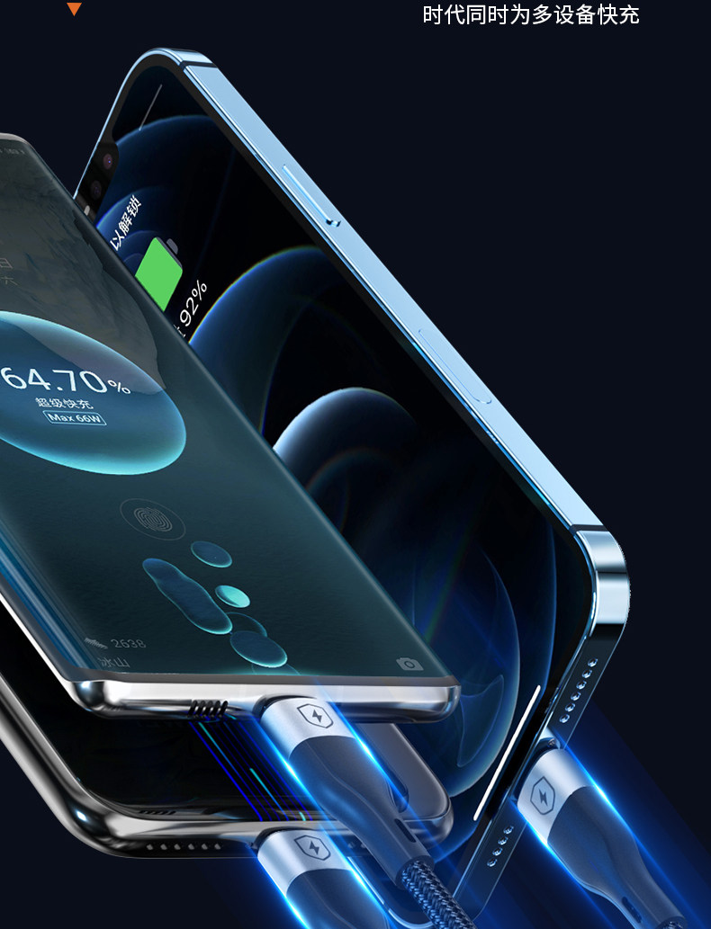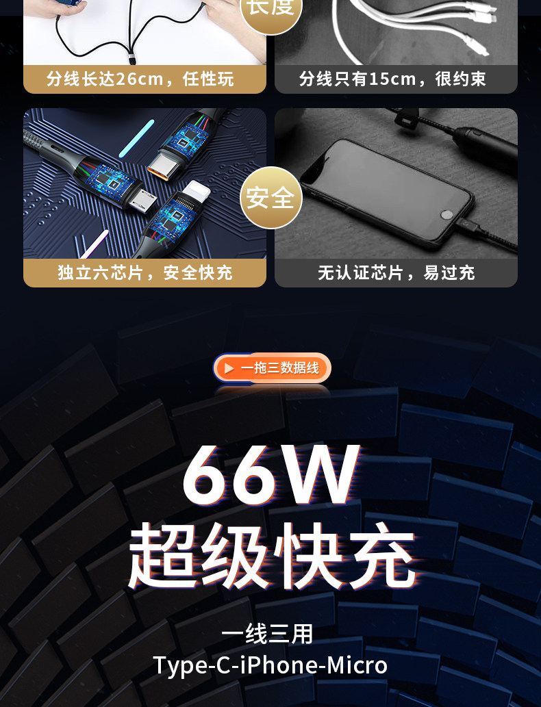Huawei, xiaomi, apple, универсальный мобильный телефон, совместимый зарядный кабель, 66W, 6A, «три в одном», андроид