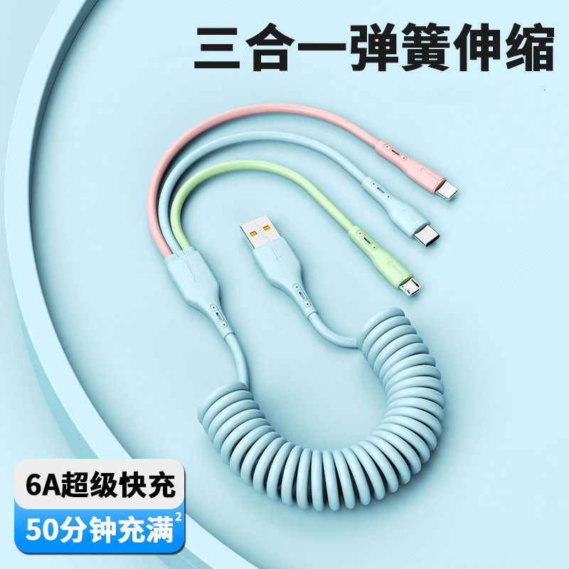 6A сверхбыстрый пружинный кабель для передачи данных «три в одном», подходит для 66 Вт Huawei mate40 Apple, автомобильный зарядный кабель «один к трем» Oppo Flash Charging typec Android Xiaomi 5A Удлиненный телескопический кабель для быстрой зарядки