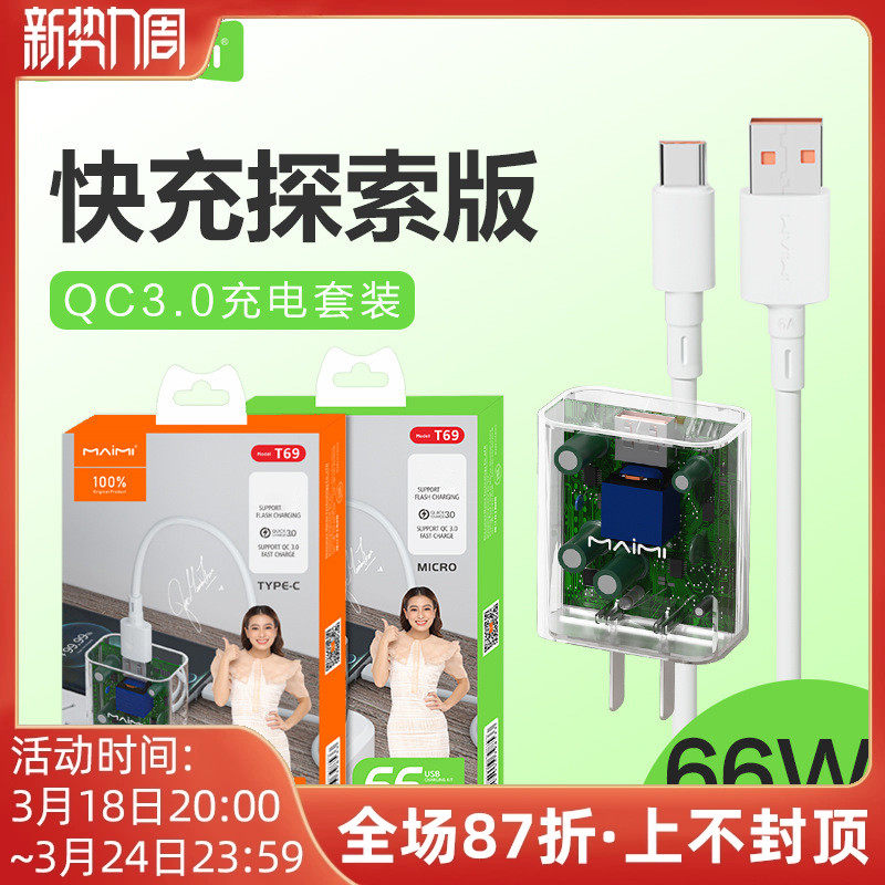 Maimi T69 Android Type-C Мобильный телефон QC3.0 Зарядка VOC Flash Зарядка Cable Mate50 40 30 Зарядная головка 66W Установите компьютер iPad CAR Universal совместимый интерфейс USB-C