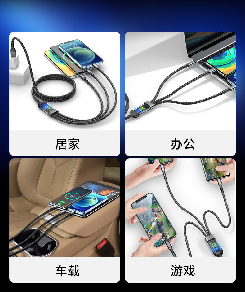 Прозрачная светящаяся 100 Вт сверхскоростная зарядка трехлокованного кабеля данных Три -в одном применении Huawei Apple Xiaomi Oppovivo Android Typec One -Traging Three Care Mobile Phone