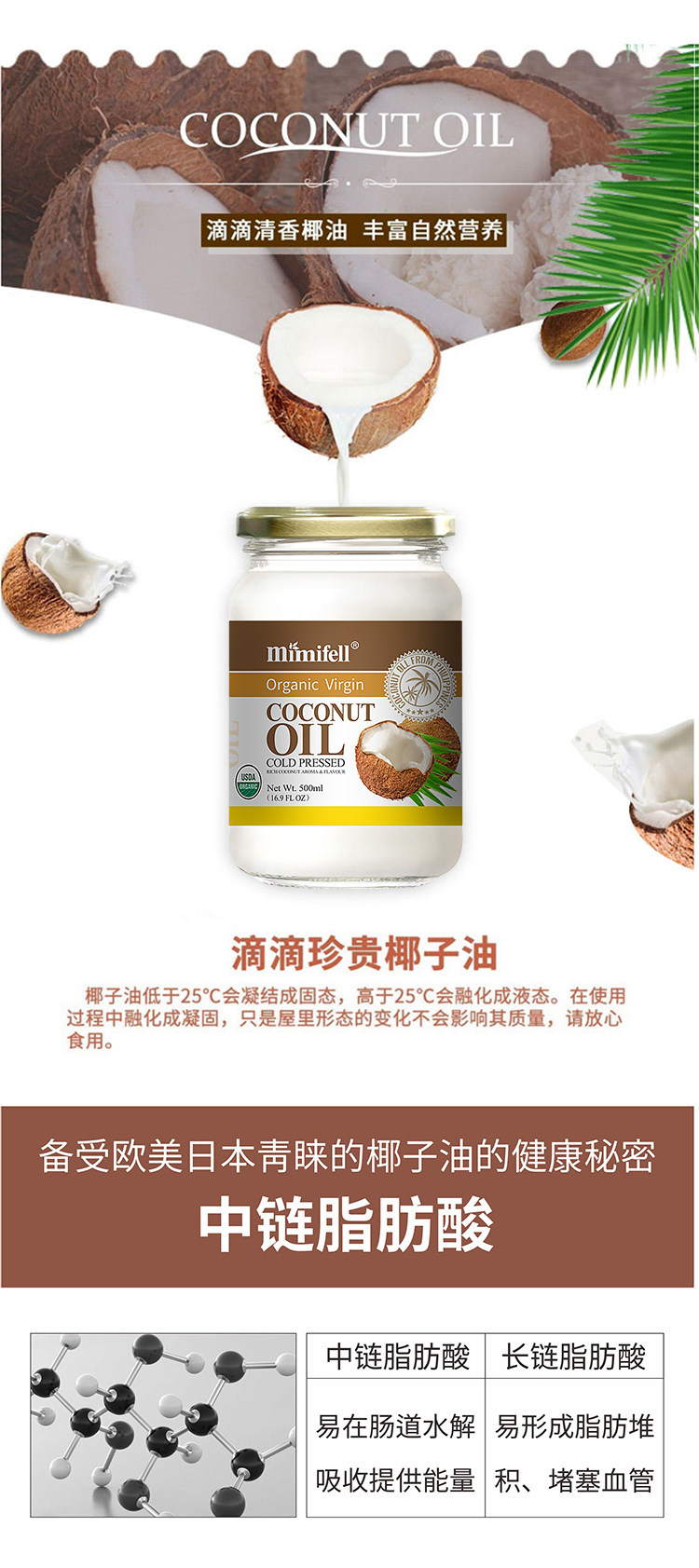 MIMIFELL Оригинальное импортное кокосовое масло для ухода за кожей, уход за волосами, 500 мл
