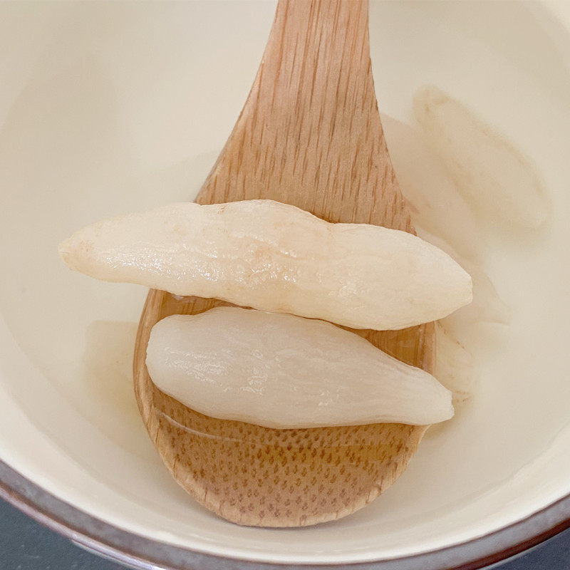 Без серы безжигают желтые и белые или бледно -желтые, со слегка заостренными концами, с тонкими продольными узорами, мягким и жестким, желтым и белым секцией, внутри с ядром, сладкие вкусы пшеницы смешаны с почвенным вкусом, с небольшим традиционным китайским медициной вкус.