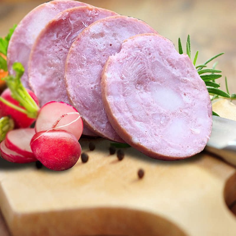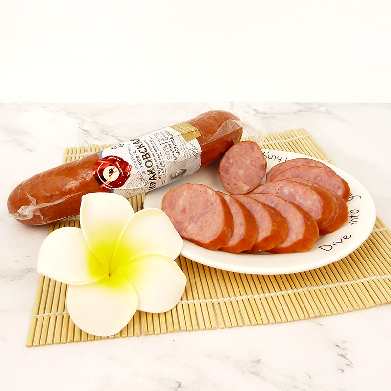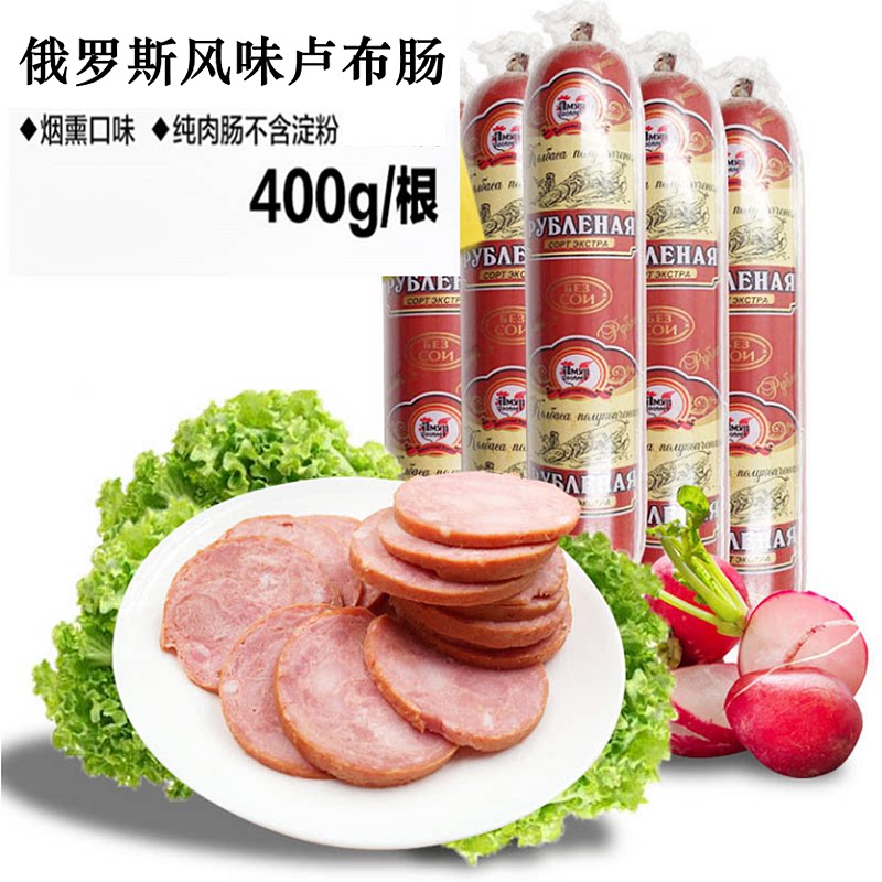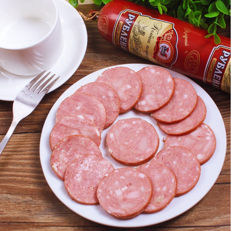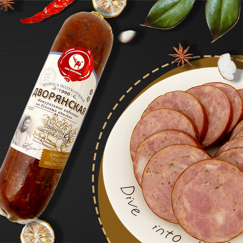 Русская кишечная колбаса из кишечника из кишечника из кишечника из кишечника из кишечника из чистого мяса открывает сумку, а затем ест винные и овощные фирменные закуски 400 г