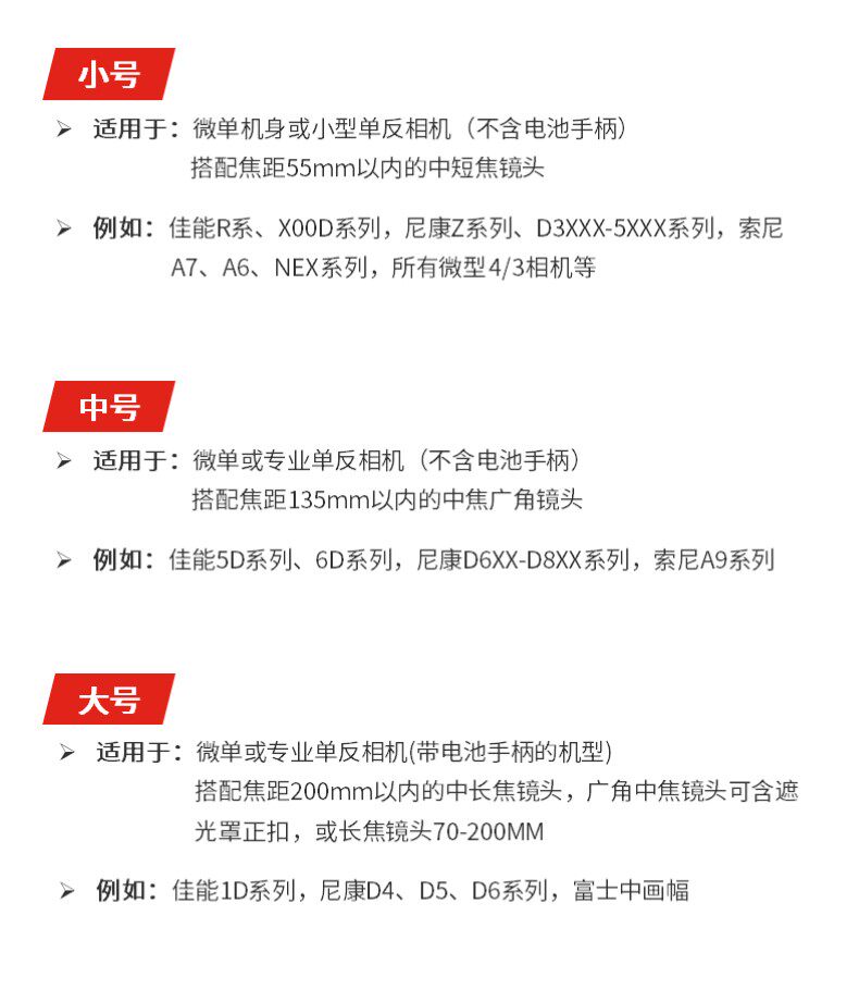 | Цвет: | Small S (микрокамера или входная SLR), Средний М (профессиональный SLR/Широкий/средний кокс), Большой L (профессиональная SLR/телеобъектив) |