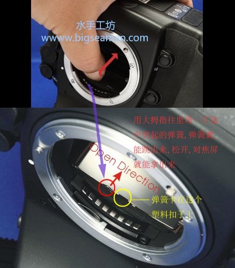 2. Возможно, использовать инструмент для разблокировки пружины, но новичок не хорошо освоен, и легко использовать инструмент, чтобы поцарапать экран фокуса и отражатель.Поэтому легко контролировать пальцами.Лучше носить крышку пальца (мы дадим вам набор пальцев).Как показано на рисунке выше, нажмите эту треугольную пружину с большим пальцем, и пружина может быть разблокирована.Экран фокуса нажимается с этой маленькой пружиной.После расстегивания весны вы можете снять экран фокуса.Там нет загадки.Этой весной иногда нужно открыть губку, чтобы увидеть.