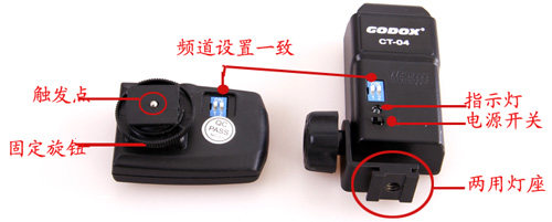 2) Вставьте вспышку в горячие ботинки приемника, включите переключатель питания приемника и установите тот же канал, что и передатчик, нажмите верхнюю кнопку передатчика, например, красный световой вспышка приемника, вспышка начала работать Полем