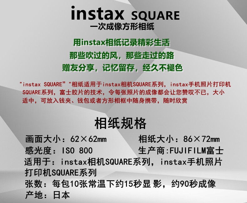 Фазовая бумага Fuji Instax квадратная квадратная фото SQ6 SQ6 SQ10 SQ20 SP3