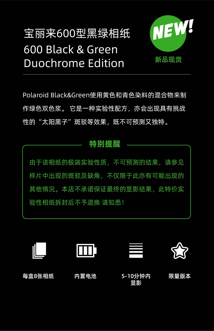 Новый поляроид/поляроидный черно -зеленый фотобумага 600 Itype Специальный эксперимент 8 лист 22 марта сейчас