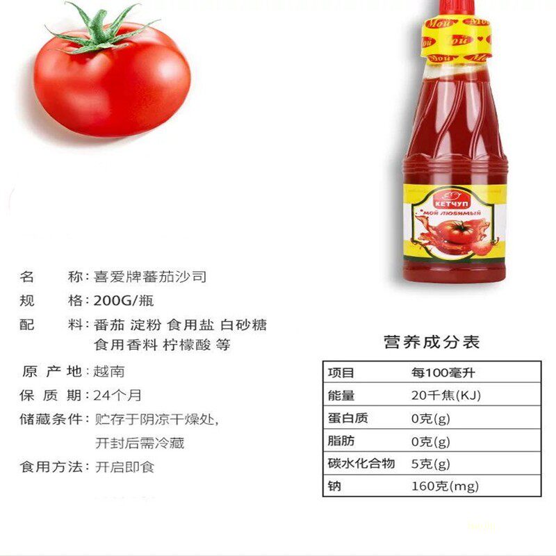 Русский аромат импортный томатный соус Цзин ЦзинРоссийский порт импортируется и производится во Вьетнаме. Он использует высококачественные некачественные помидоры в качестве сырья, передового производства и обработки мастерства, создавая вкусное томатное соус, с барбекю, фри, гамбургерами, итальянской лапшой, лапшой китайской стили, очень вкусный!Сладкая и кислая - настоящая жизнь!