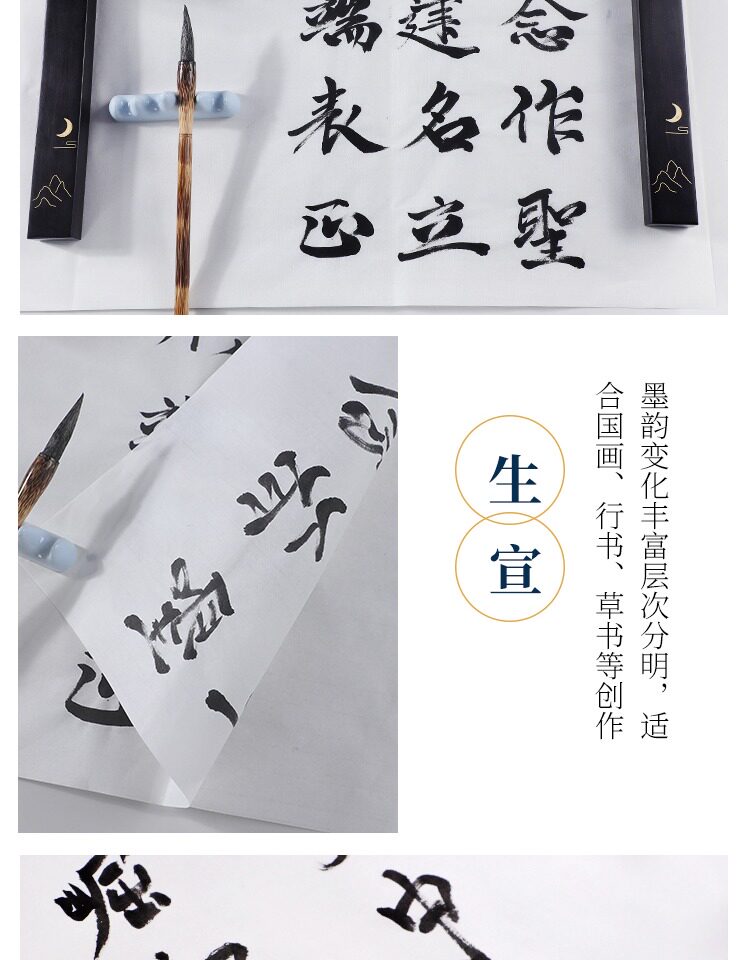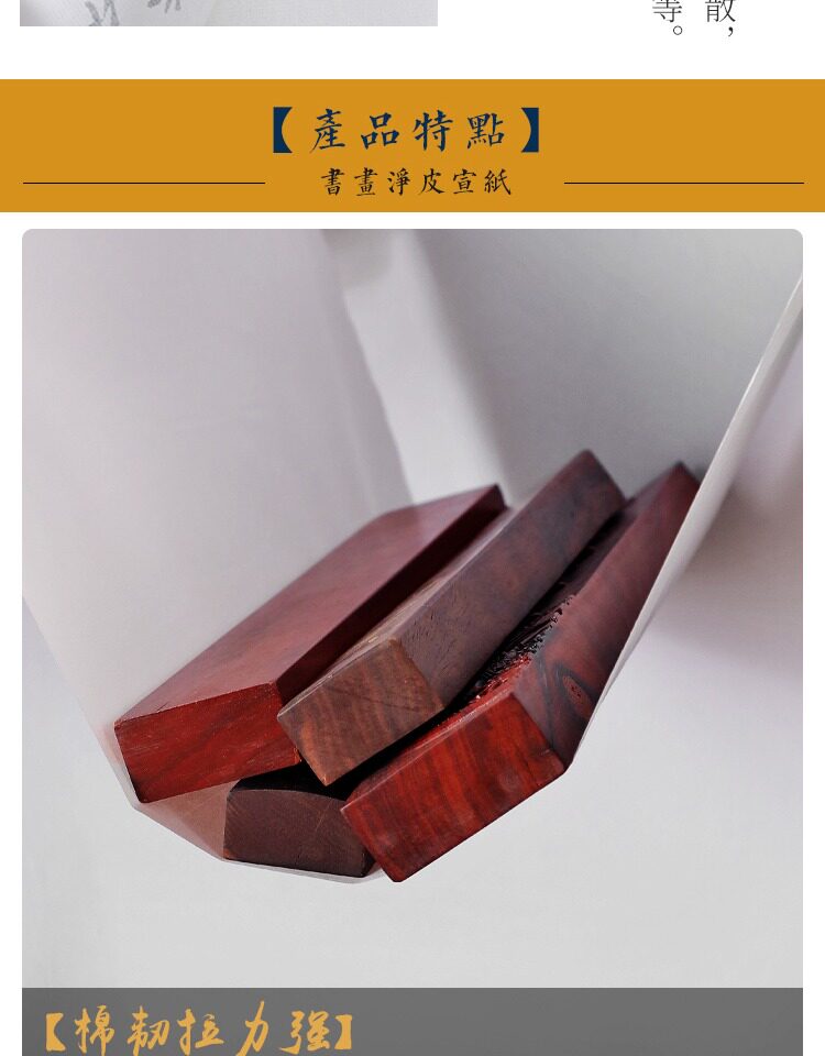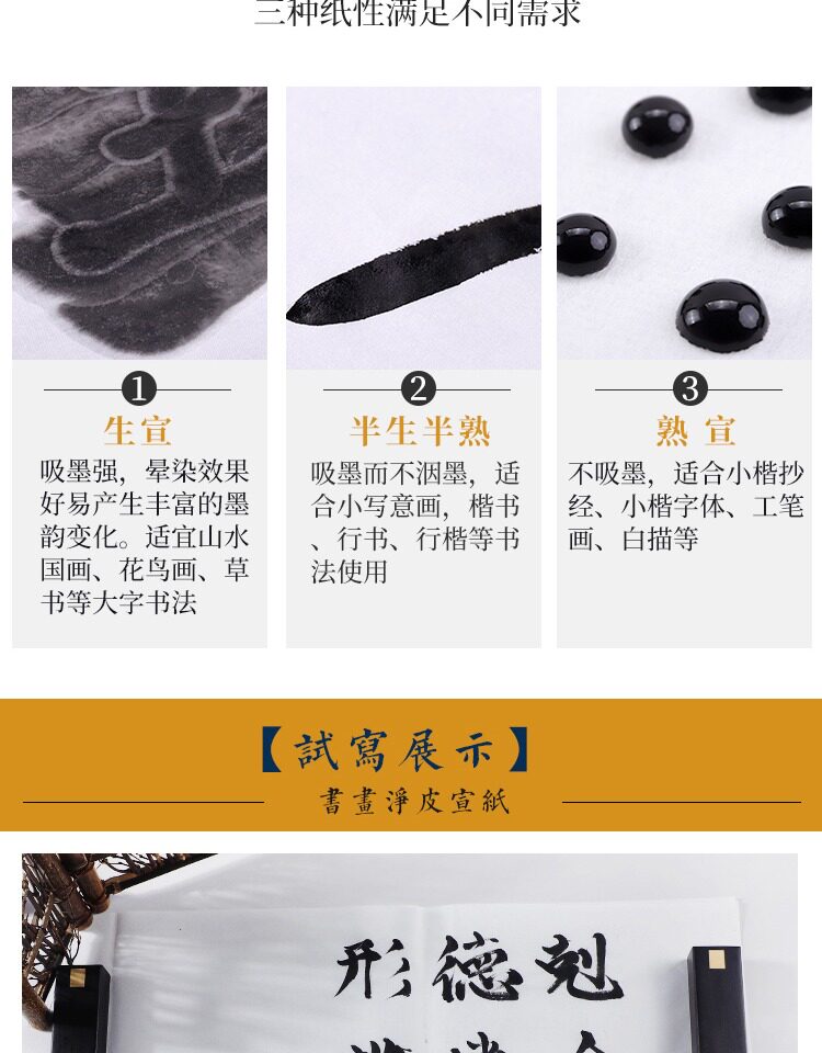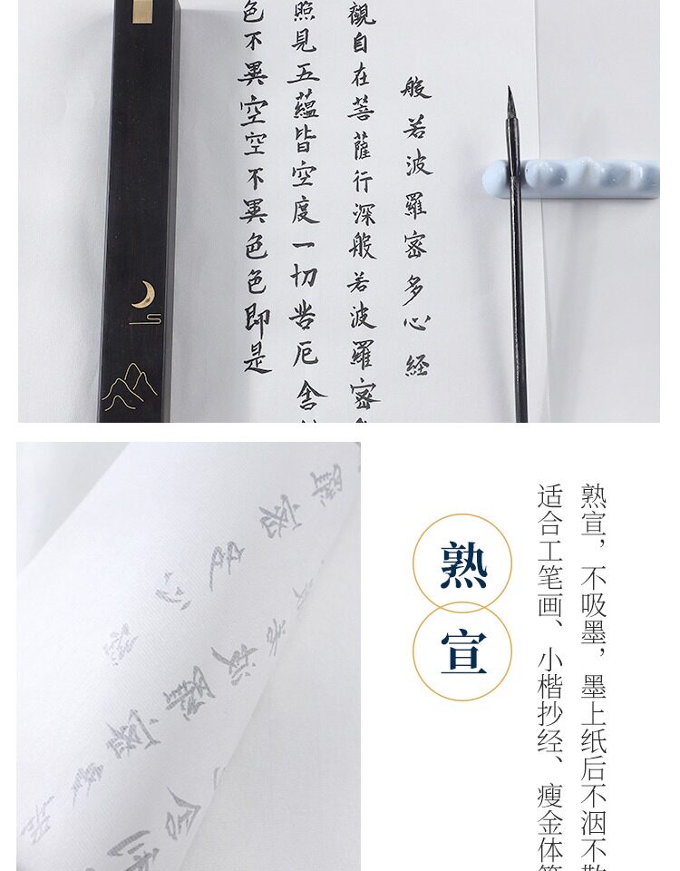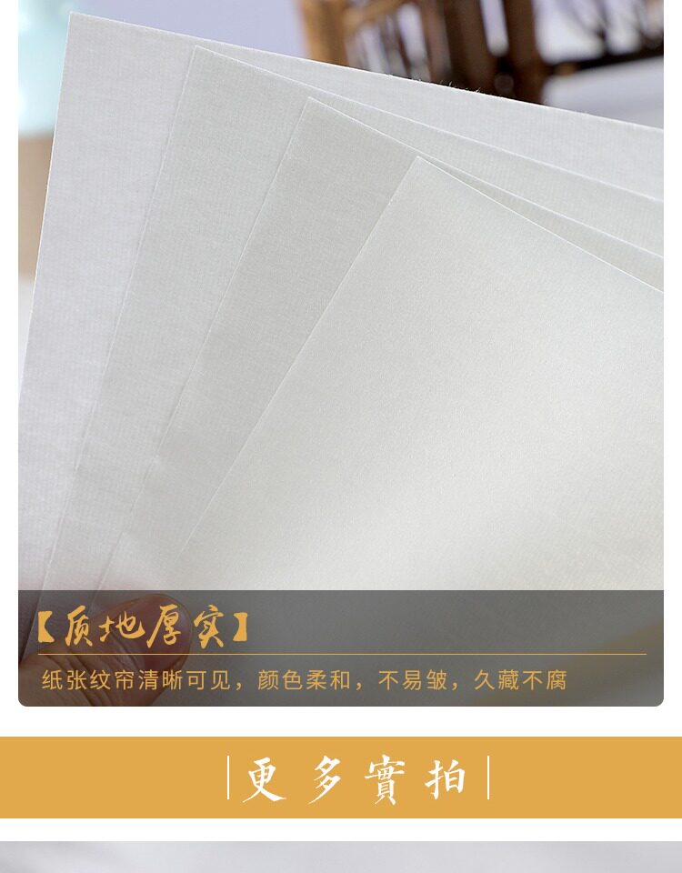 | Бумажный атрибут: | Shengxuan (сильное поглощение чернил), Полураспада и наполовину (медленное поглощение чернил), Знаменитая пропаганда (не чернила чернила), Юнму приготовленная пропаганда (с основными моментами) |