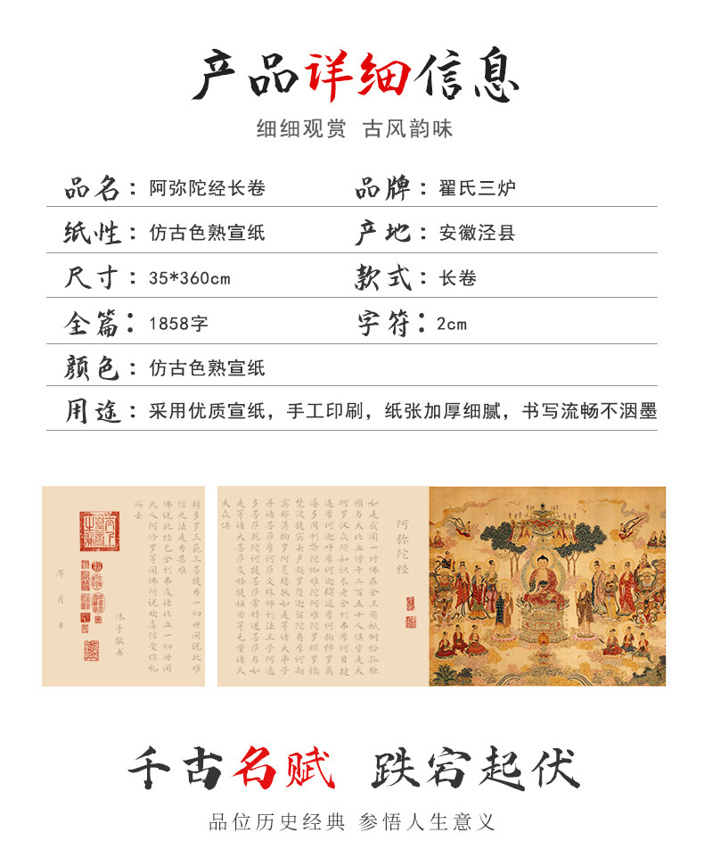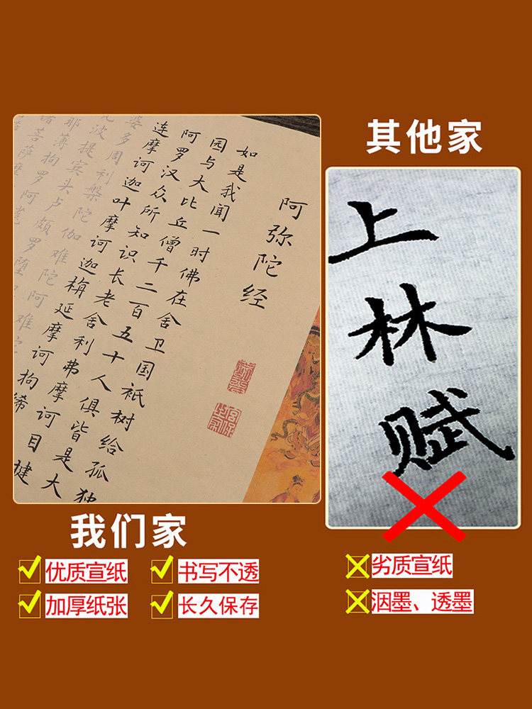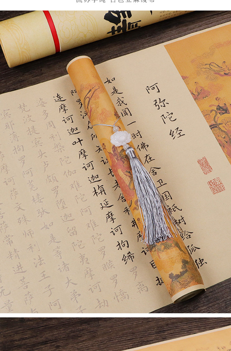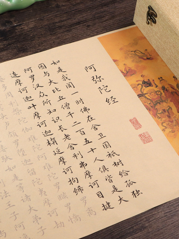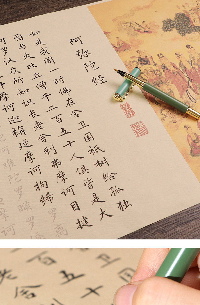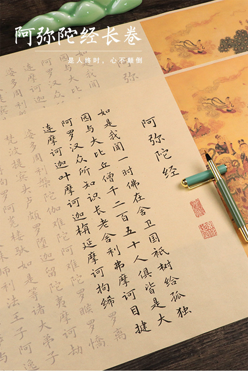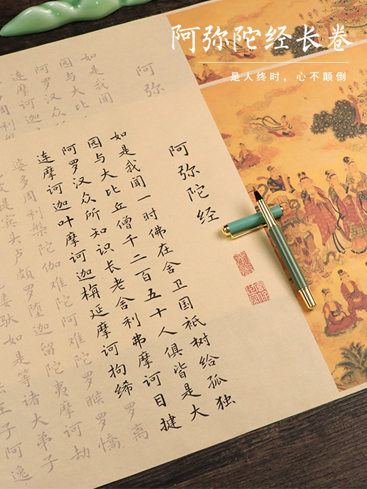 Сутра Амитабхи: Восемь великих просветлений трех миров, Причина и следствие Длинный свиток духовного полета, Медитируйте, чтобы скопировать эту статью, Тетрадь кисти Чжэнмин Сяокай, Великое сострадание и благоприятный рукописный экземпляр, Медитируйте, чтобы практиковать каллиграфию