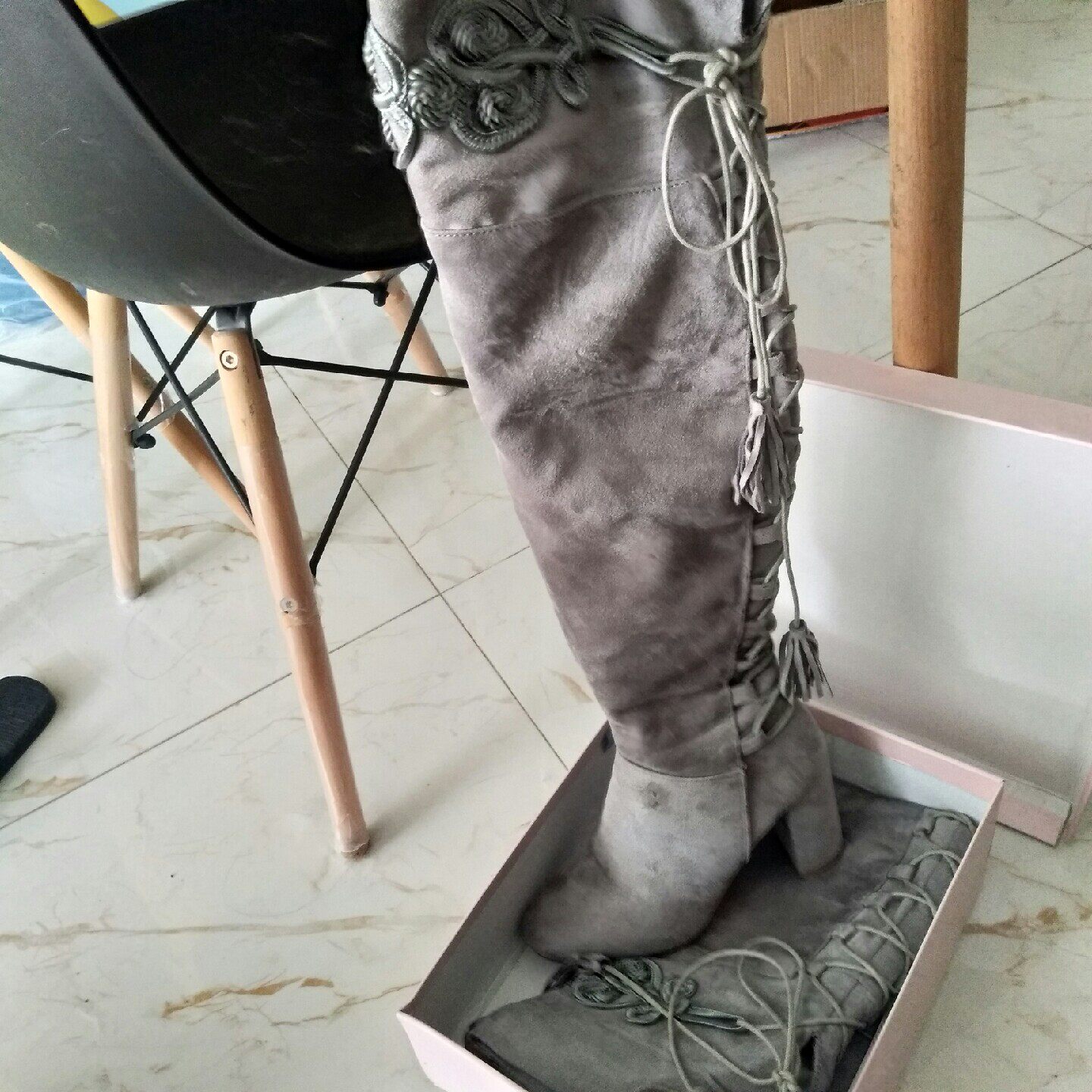 Серый замшевый ремешок с толстым каблуком с высокой точки зрения -длинные ботинки
