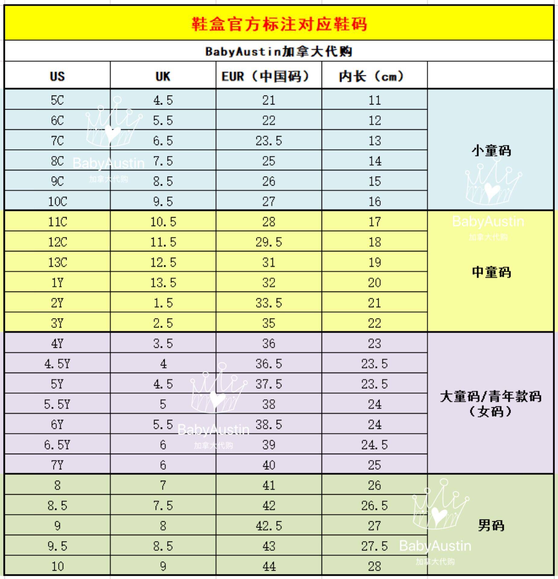| Размер обуви: | 35.5, 5c (длина 21 ярдов 11 см), 6c (22 ярда, более 12 см), 7c (23,5 ярдов-13см в длину), 8C (длину 25 ярдов 14 см), 9c (26 ярдов 15 см длиной), 10c (27 ярдов-длины 16 см), 11c (длину 28 ярдов 17 см), 12c (29,5 ярдов-длины 18 см), 13c (31 ярды, проведенный 19 см), 1y (32 ярда-мгновенные 20 см), 2y (33,5 ярда-мгновенные 21 см), 3Y (35 ярдов 22 см), 4y (36 ярдов), 4,5y (36,5 ярдов), 5y (37,5 ярдов), 5,5y (38 ярдов), 6y (38,5 ярдов), 6,5y (39 ярдов), 7y (40 ярдов), Код US8 (41 ярды), Код US8.5 (42 ярда), Код US9 (42,5 ярда), Код US9,5 (43 ярда), Код US10 (44 ярда) |