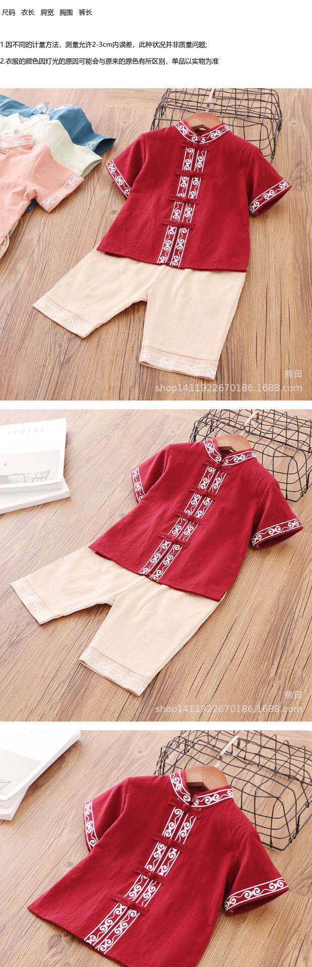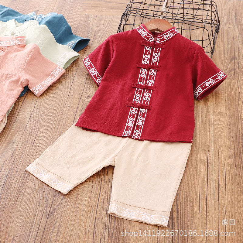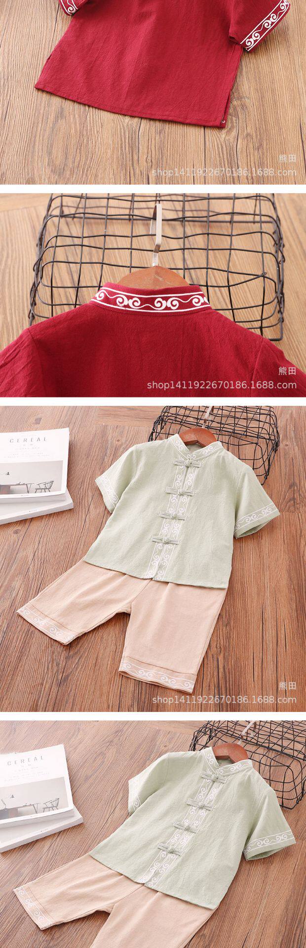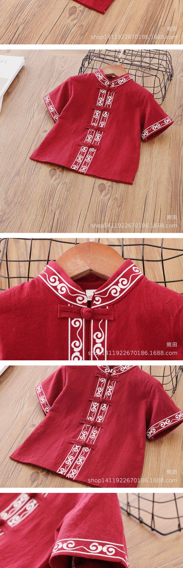Детское ханьфу для мальчиков, красное платье, китайский стиль, короткий рукав, детская одежда, из хлопка и льна