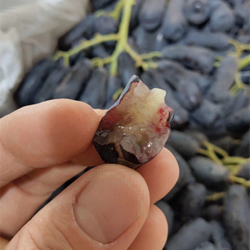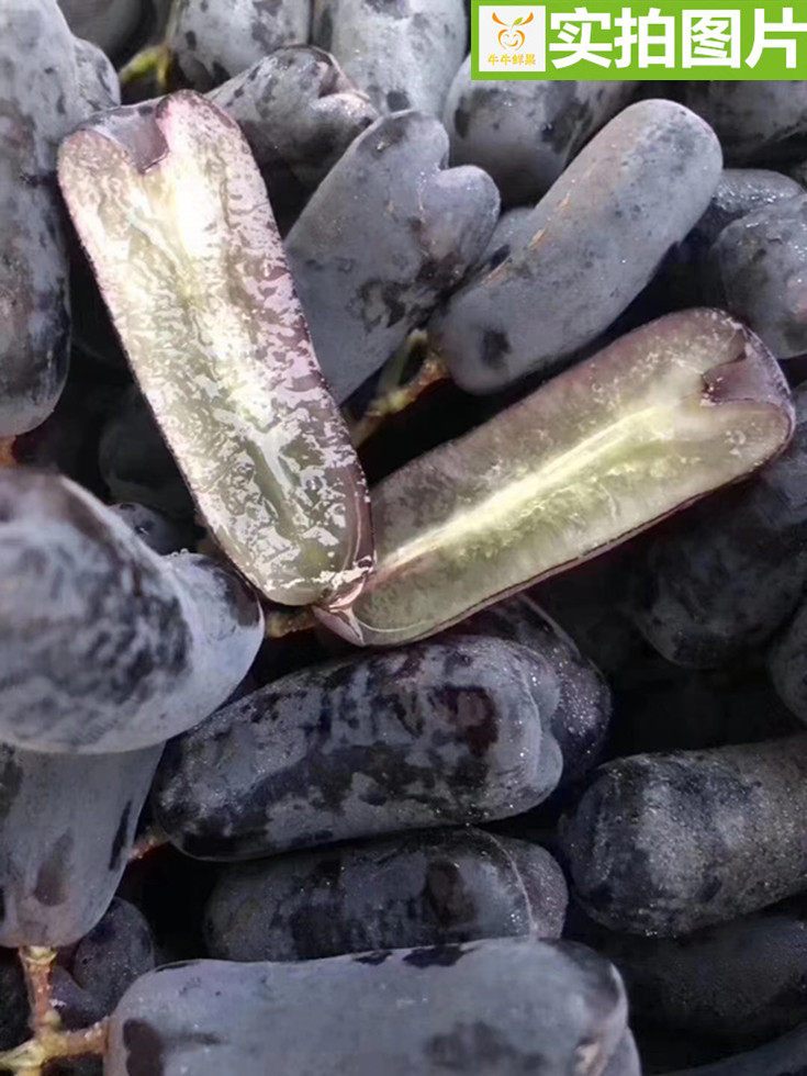 Черный виноград Голдфингер без косточек, с изящной фигурой аристократического происхождения, кожица и мякоть плода не легко очищаются, кожица тонкая и жесткая, мякоть мягкая, вкус не такой простой, как сладкий, у него уникальный аромат зефира, один укус, рот полон сока, очень сладкий!