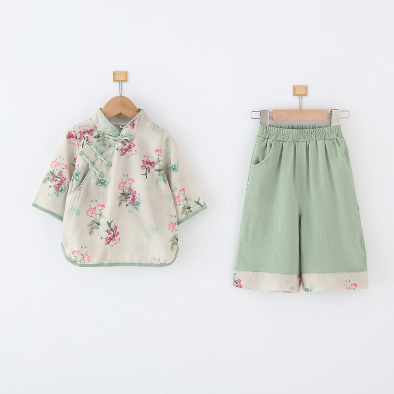 Ципао, штаны, летний комплект, цветочный принт, свободный крой, китайский стиль, осеннее
