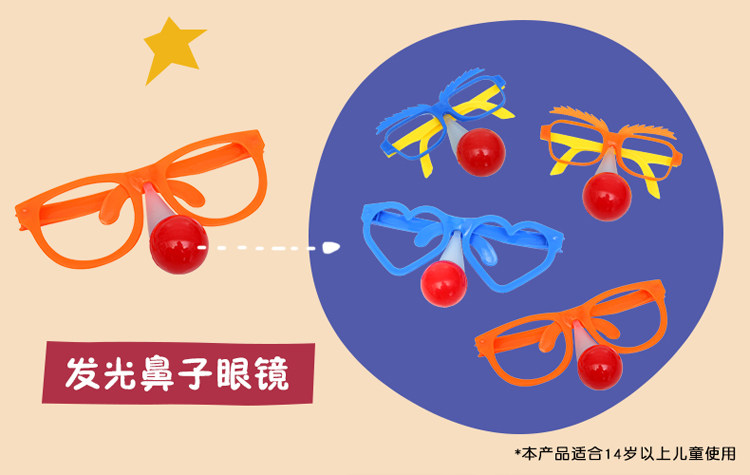 Эти очки имеют красный нос клоуна и небольшой выключатель в носу, который может многократно переключать переключатель, чтобы управлять, светится ли нос.