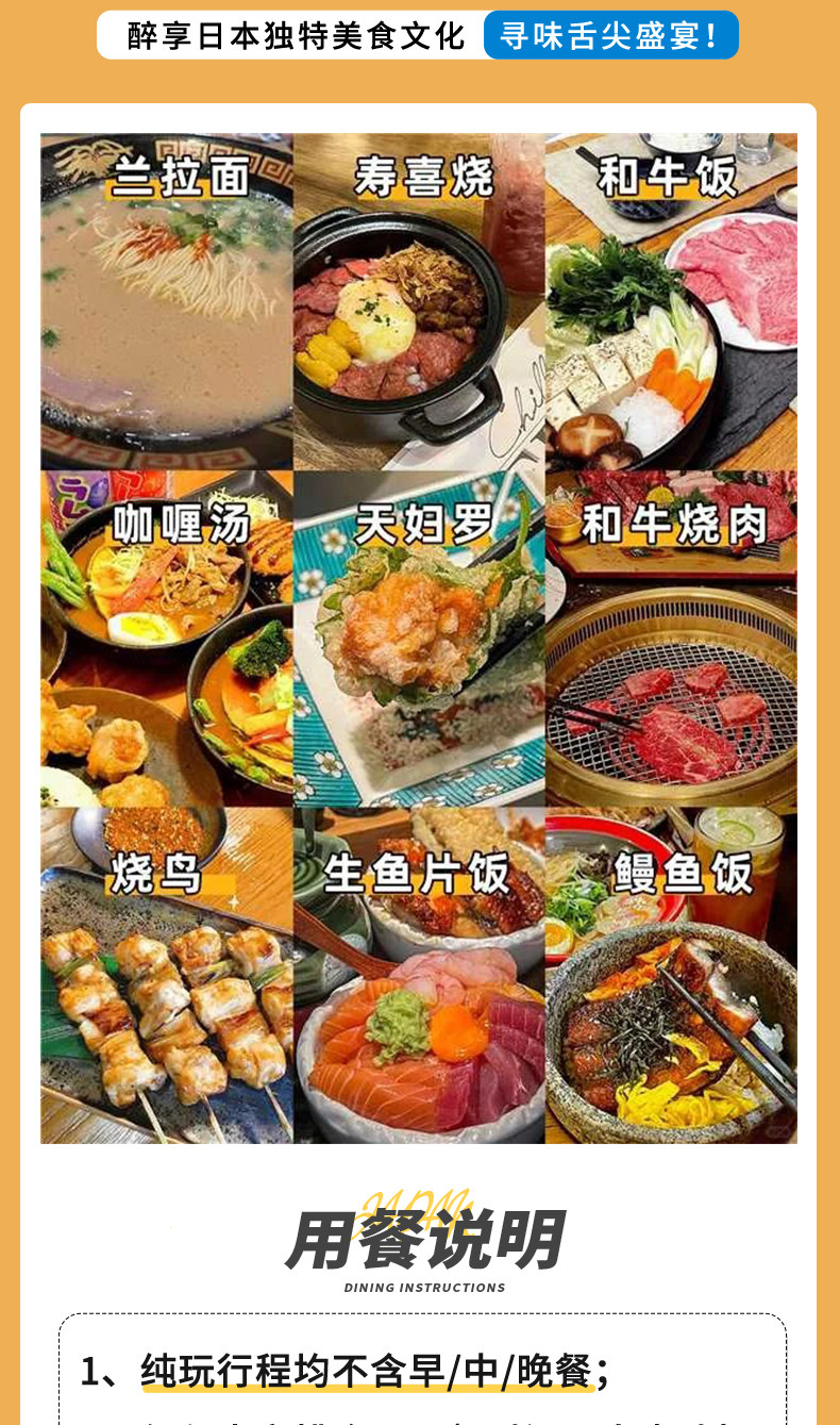 [Теплое напоминание] В Японии часто бывают пробки. Однодневным туристам рекомендуется не бронировать ужин и другие мероприятия заранее, особенно тем, у кого рейс в тот же день.Если вы пропустите бронирование из-за пробки, мы не несем ответственности за компенсацию. Мы надеемся, что вы понимаете.