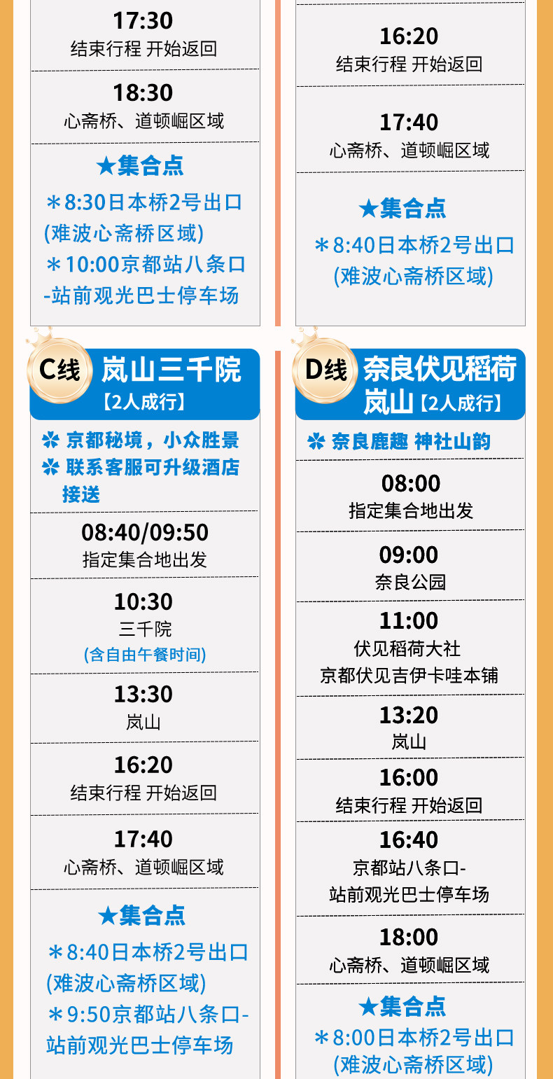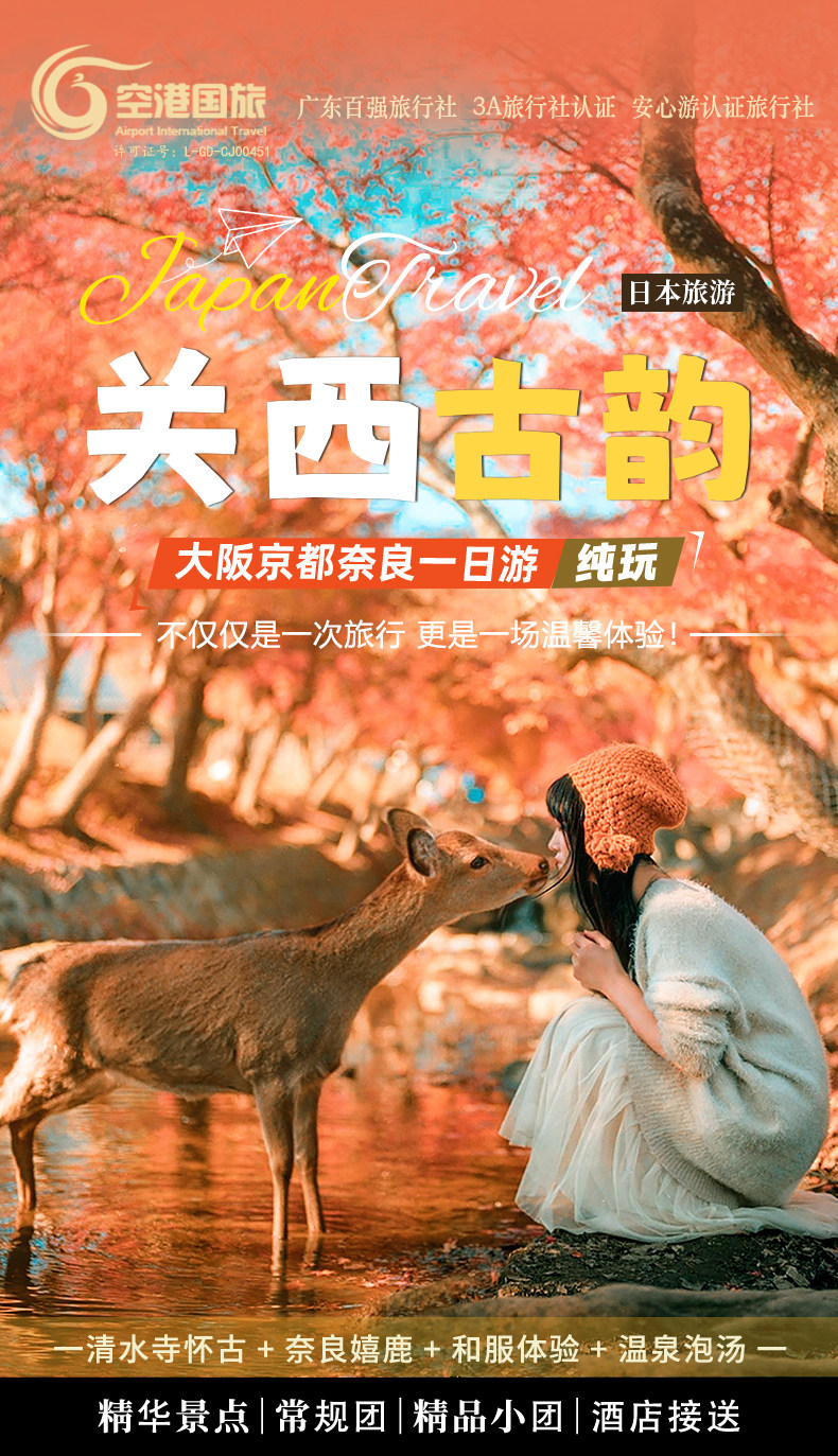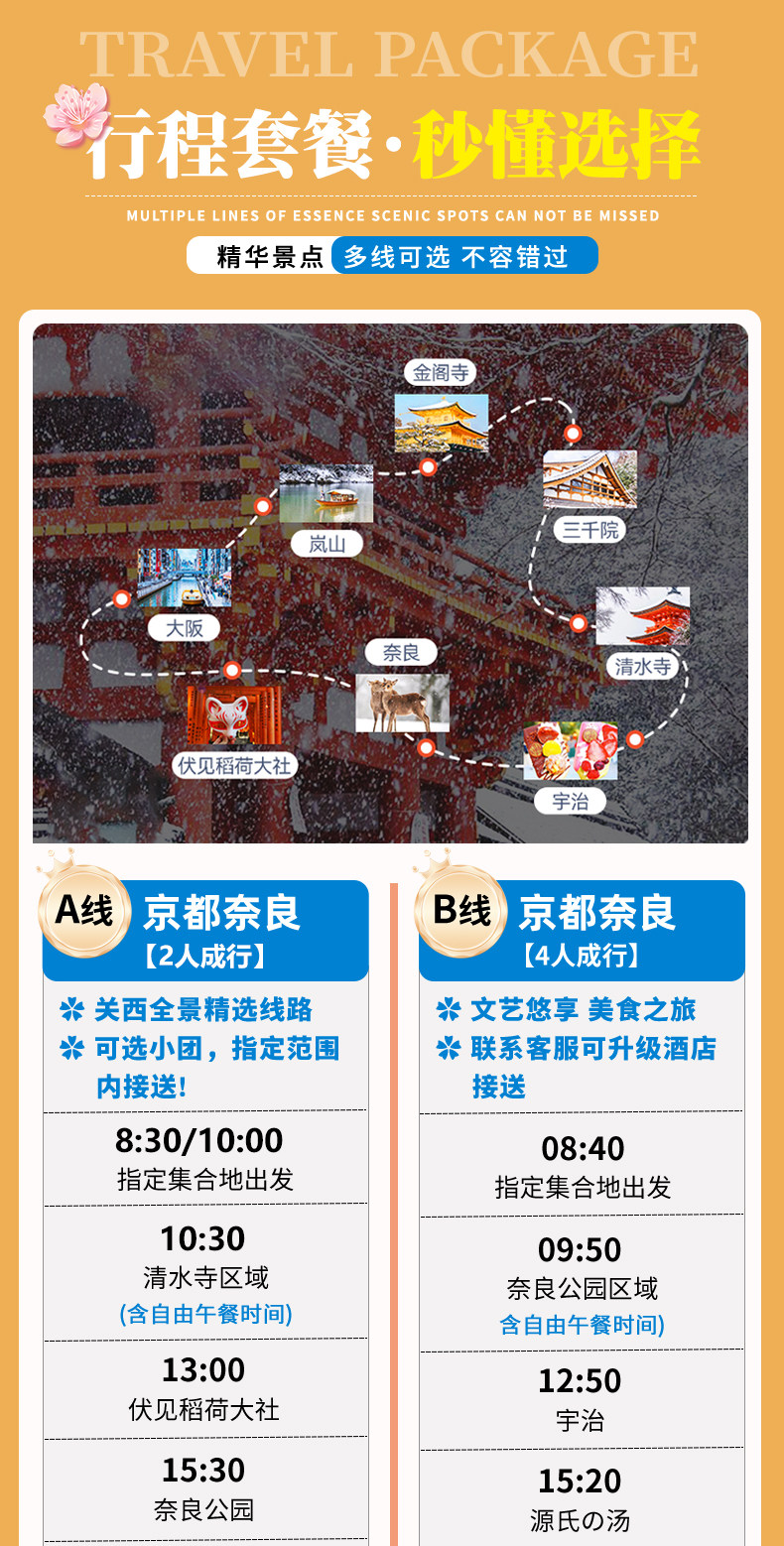 | Тип пакета: | Милый олень Нара Храм Киёмидзу Фусими, Горячий источник БНара Удзи Матча, F Киото Кифунэ Арасияма, C Горячий источник Арасияма Сандзэнин в Киото, ДНара Фусими Инарасияма, Традиционный японский храм Кинкакудзи в ЭКиото. |