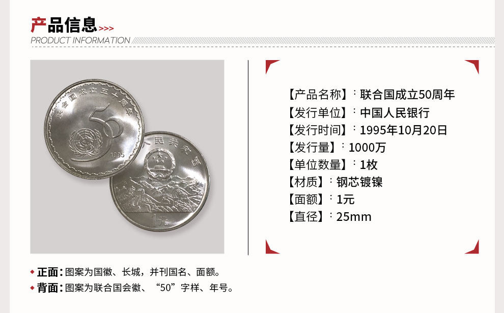 [Том снос новый] 1995 года 50 -летие памятной монеты Организации Объединенных Наций Объединенная монета Объединенная монета