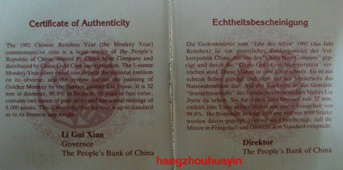 В 1992 году в 1 унции обезьян зодиака использовались обезьяны серебряной монеты, чтобы отметить серебряные монеты 10 Юань. Серебряная обезьяна