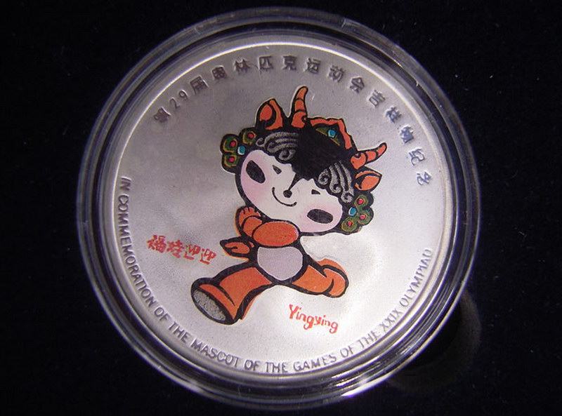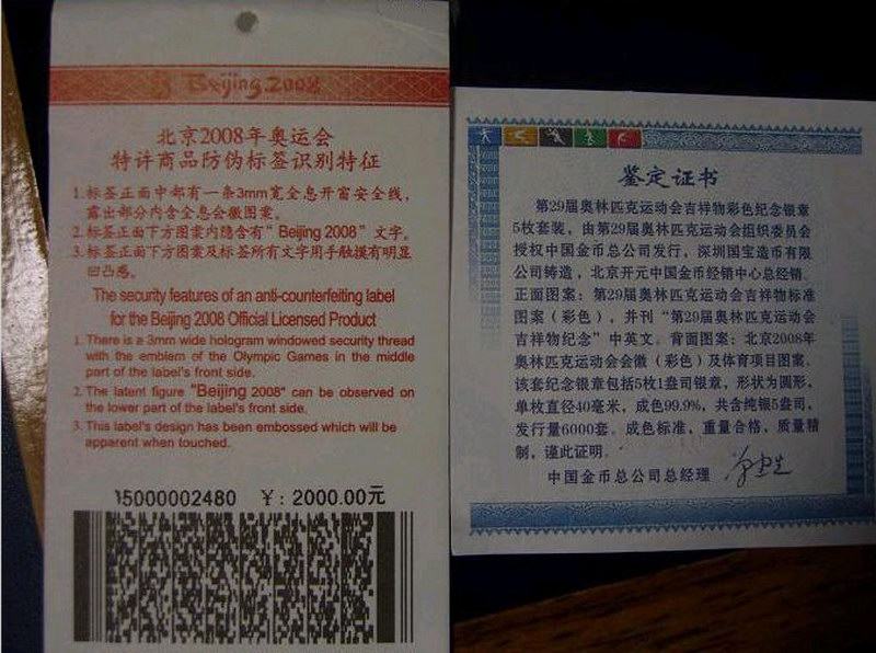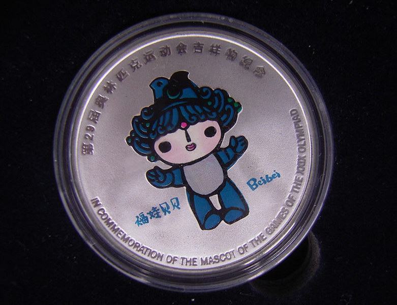Драгоценные 5 наборов из 29 -го талисмана Олимпийских игр для 29 -й Олимпийских игр, продюсированных Шанхайским монетным двором, с передним шаблоном в качестве 29 -й Олимпийской талисман Fuwa Fuwa“ beibei, jingjing, huanhuan, yinging, nini&Rdquo;, обратное - это олимпийская эмблема и футболист Пекин Полем