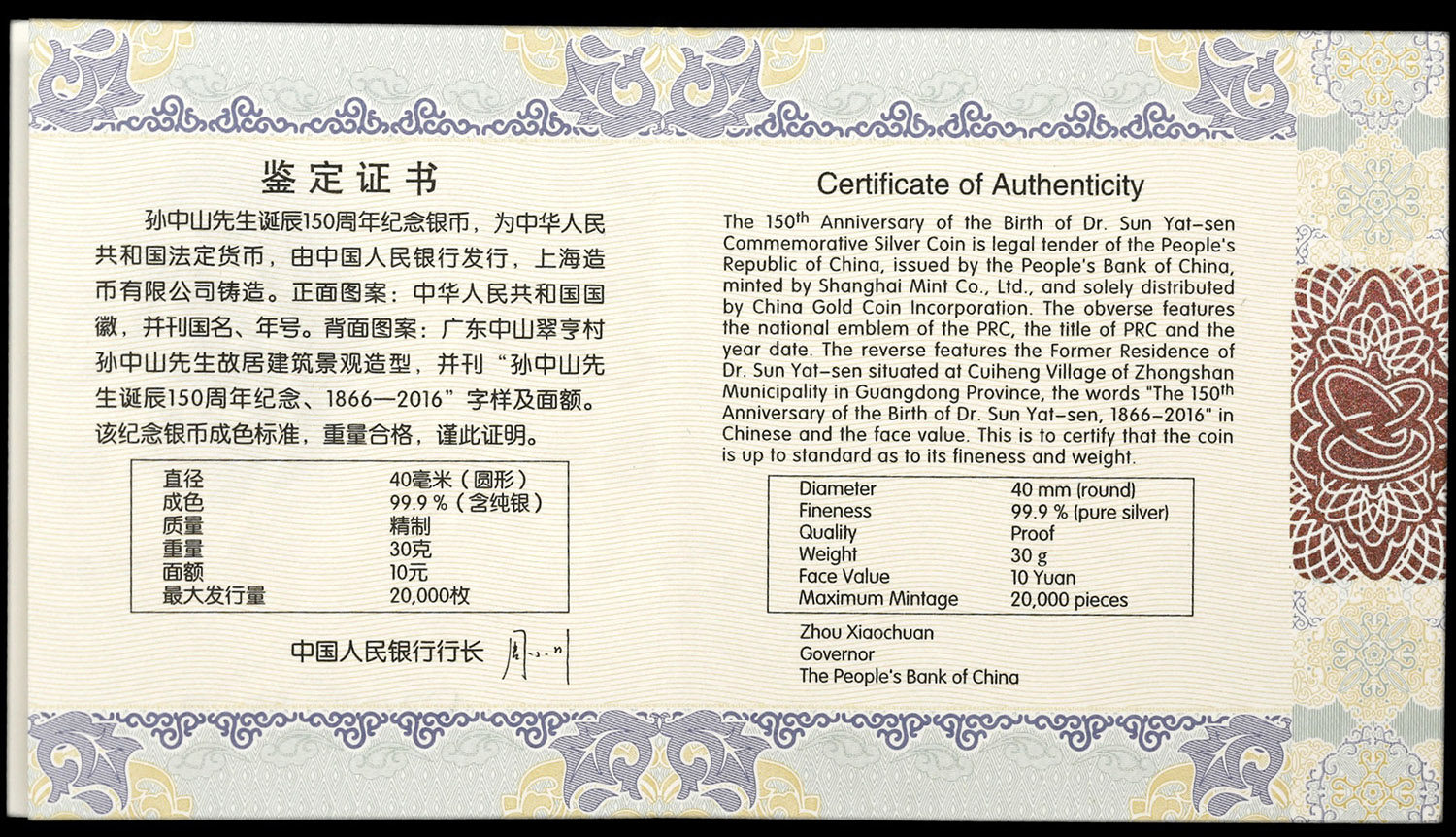 [New Bazhen] Оригинальная коробка оригинальной коробки 2016 30 грамм Сан -Грода Сань Ят -Сен 150 -летие Серебряная монета