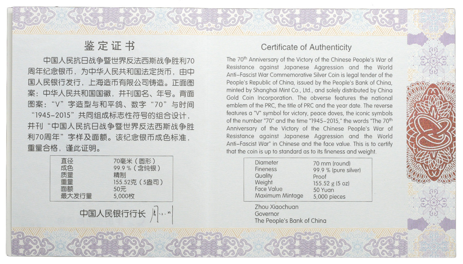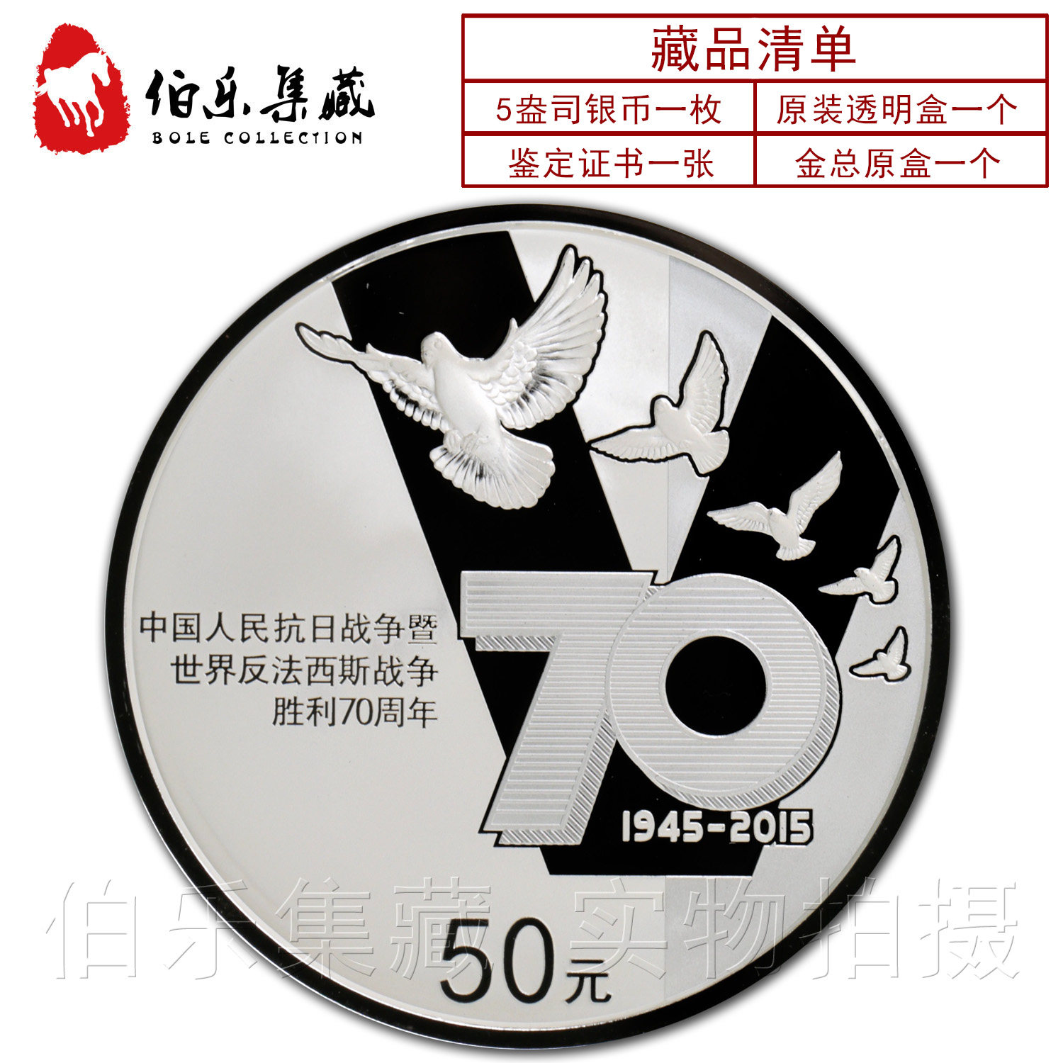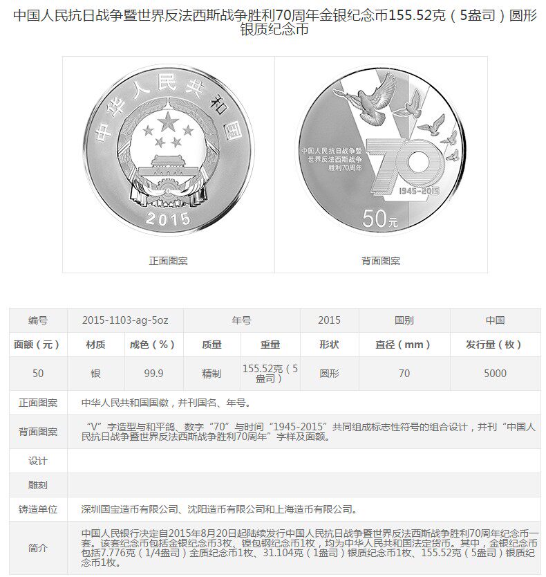 [Новый Баозен] Оригинальный сертификат коробки 2015 5 унций анти -японской войны победы 70 -летие серебряной монеты