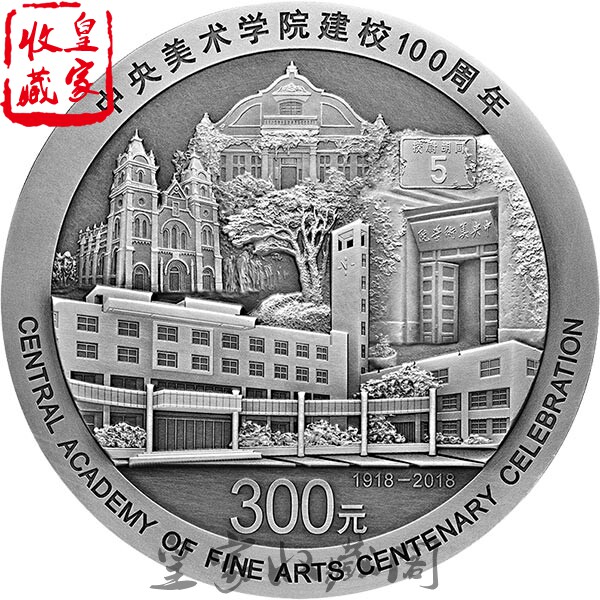 Узор на оборотной стороне 30-граммовой круглой серебряной памятной монеты представляет собой комбинацию типичных инструментов представительных дисциплин Центральной академии художеств, эмблемы школы и других элементов и опубликован.“100-летие со дня основания Центральной Академии Художеств.” китайские слова,“ЦЕНТРАЛЬНАЯ АКАДЕМИЯ ИЗОБРАЗИТЕЛЬНЫХ ИСКУССТВ ПРАЗДНОВАНИЕ СТОЛЕТИЯ” английские слова,“1918-2018” и лицо.