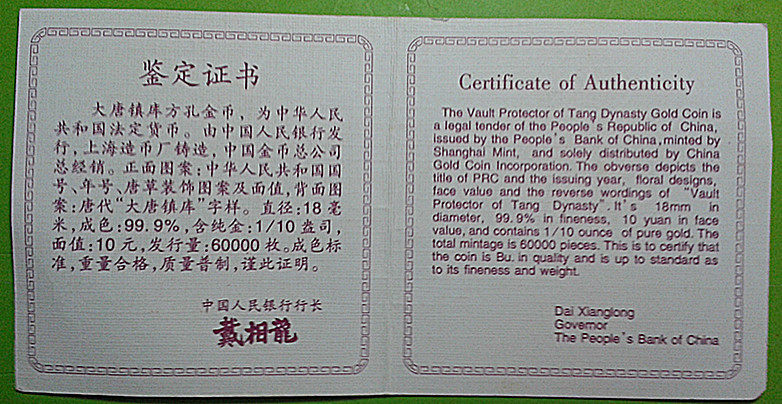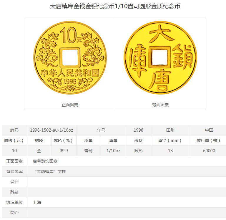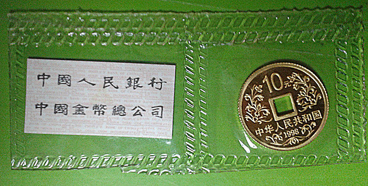 [New Bazhen] В 1998 году, единственная монета Fang Kong с золотой монетой с золотой монетой золотой монеты с 1/10 унцией в городе Датанг