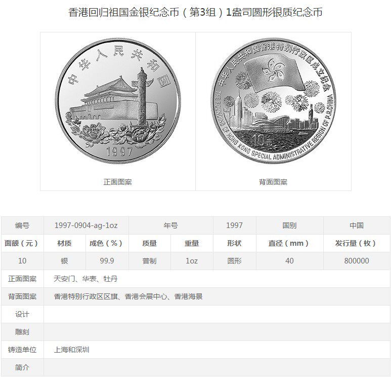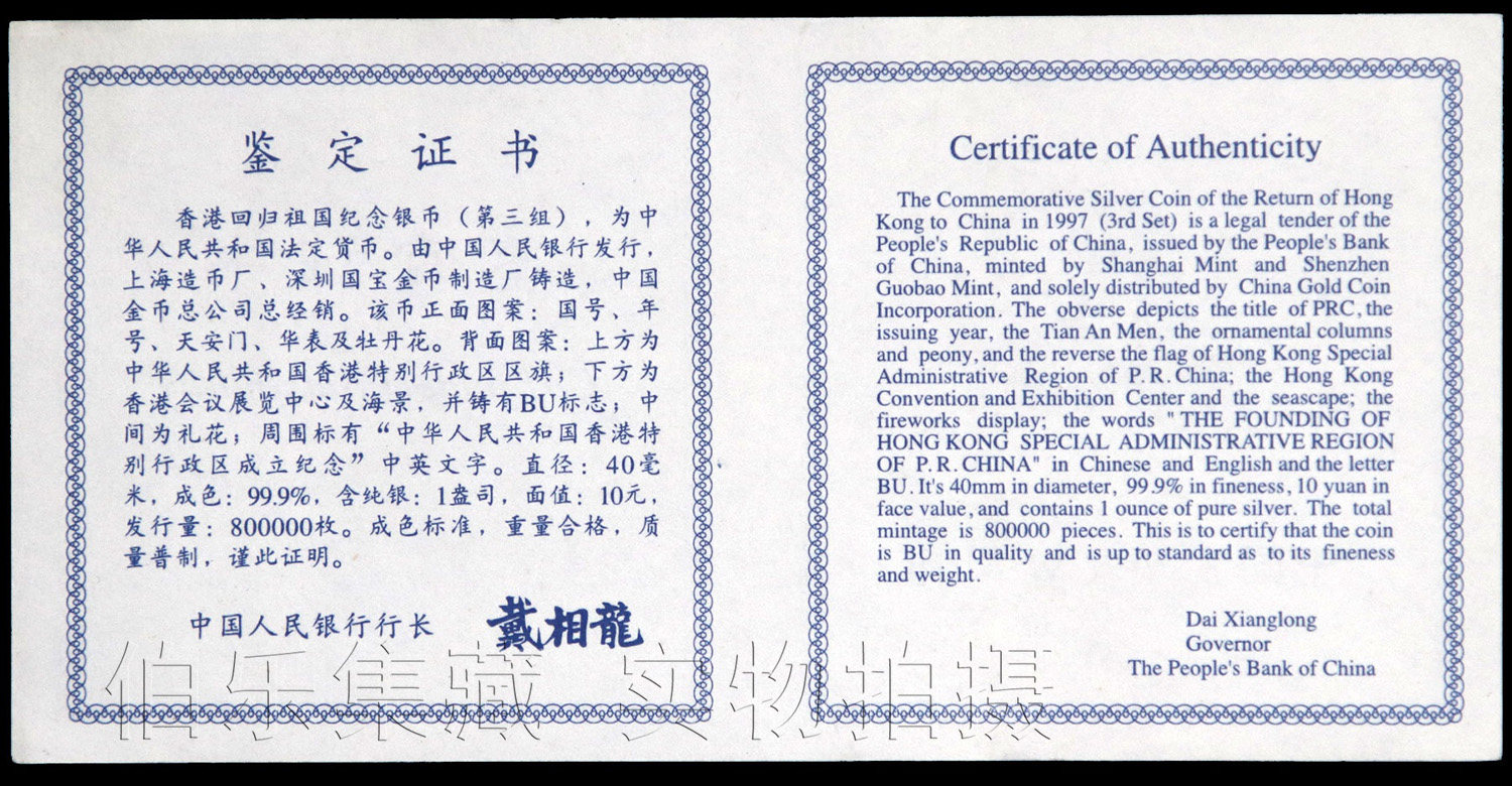 [Новый Баозен] 1 унция сертификата, популярная в 1997 году, Гонконг вернулся в третью группу памятных серебряных монет на родине