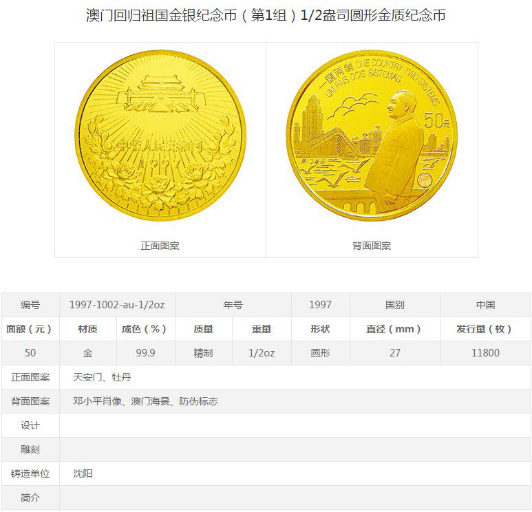 [New Bazhen] В 1997 году 1/2 унции Макао вернулась в первую группу памятных золотых монет с родиной