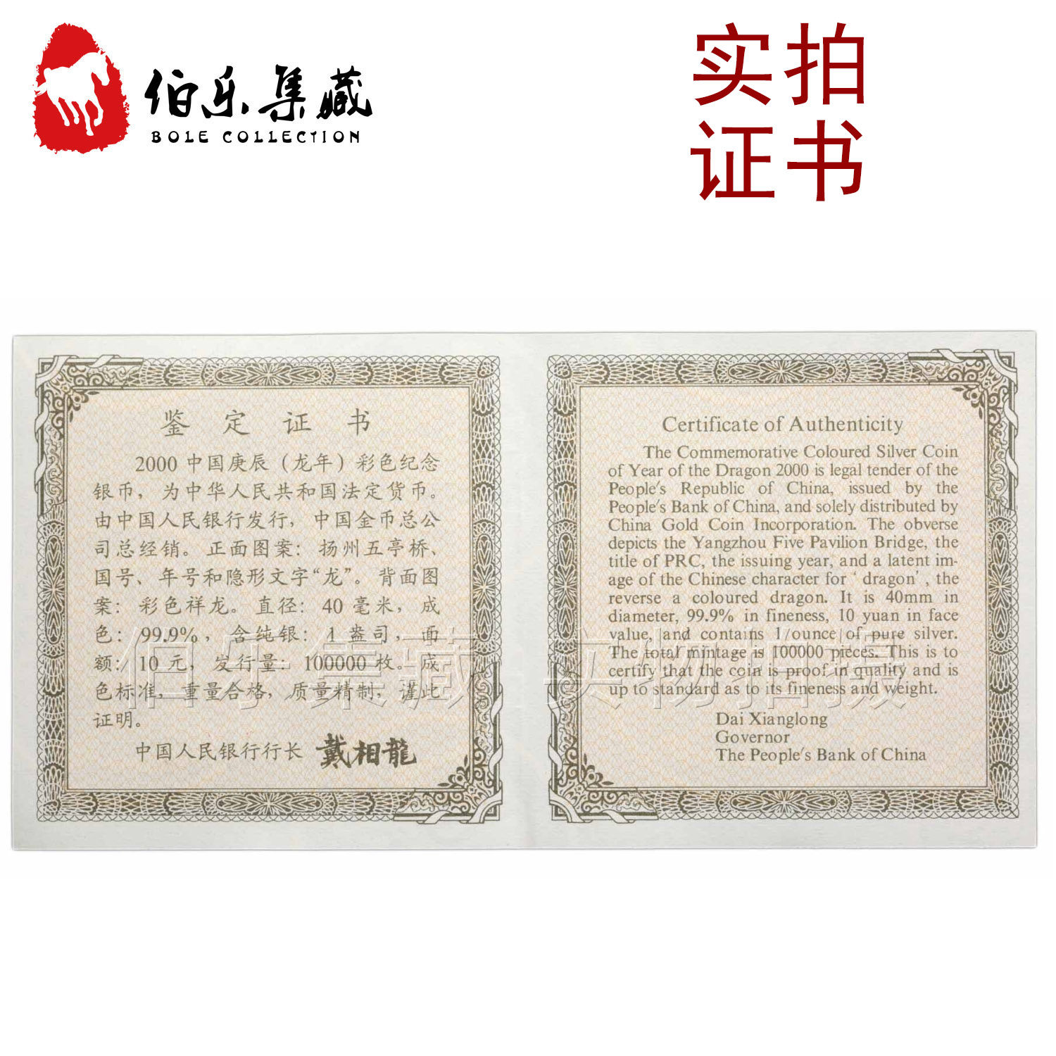[New Bazhen] Сертификат с сертификатом в 2000 году, 1 унция дракона Dragon Dragon Dragon, цвет серебряной монеты серебряный дракон
