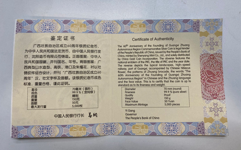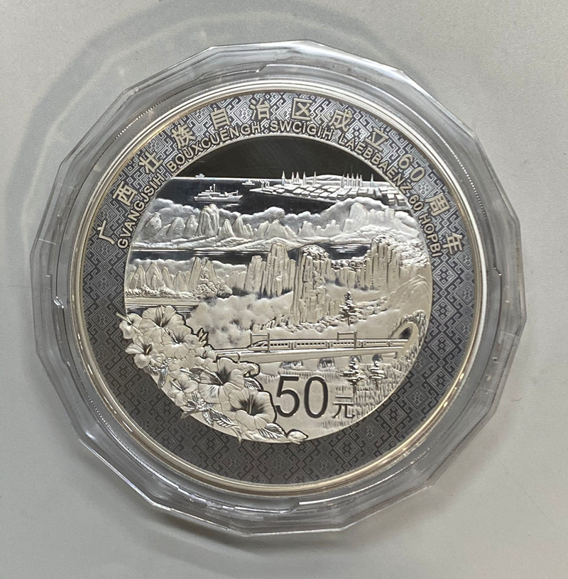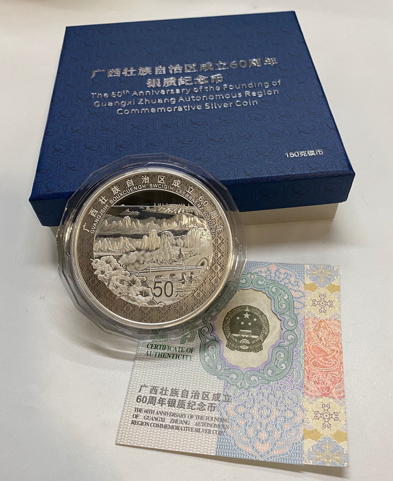 60 -летие создания автономного региона Гуанси Чжуан в 2018 году .150 грамм. Серебряная монета Гуанси.