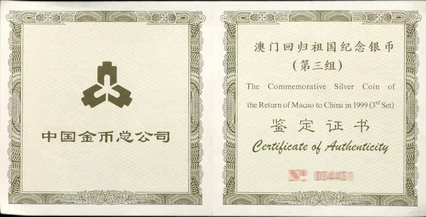 В 1999 году 5 унций Макао вернулись к 3 -й группе Сертификат Серебряной монеты № 3 Макао Серебряная монета