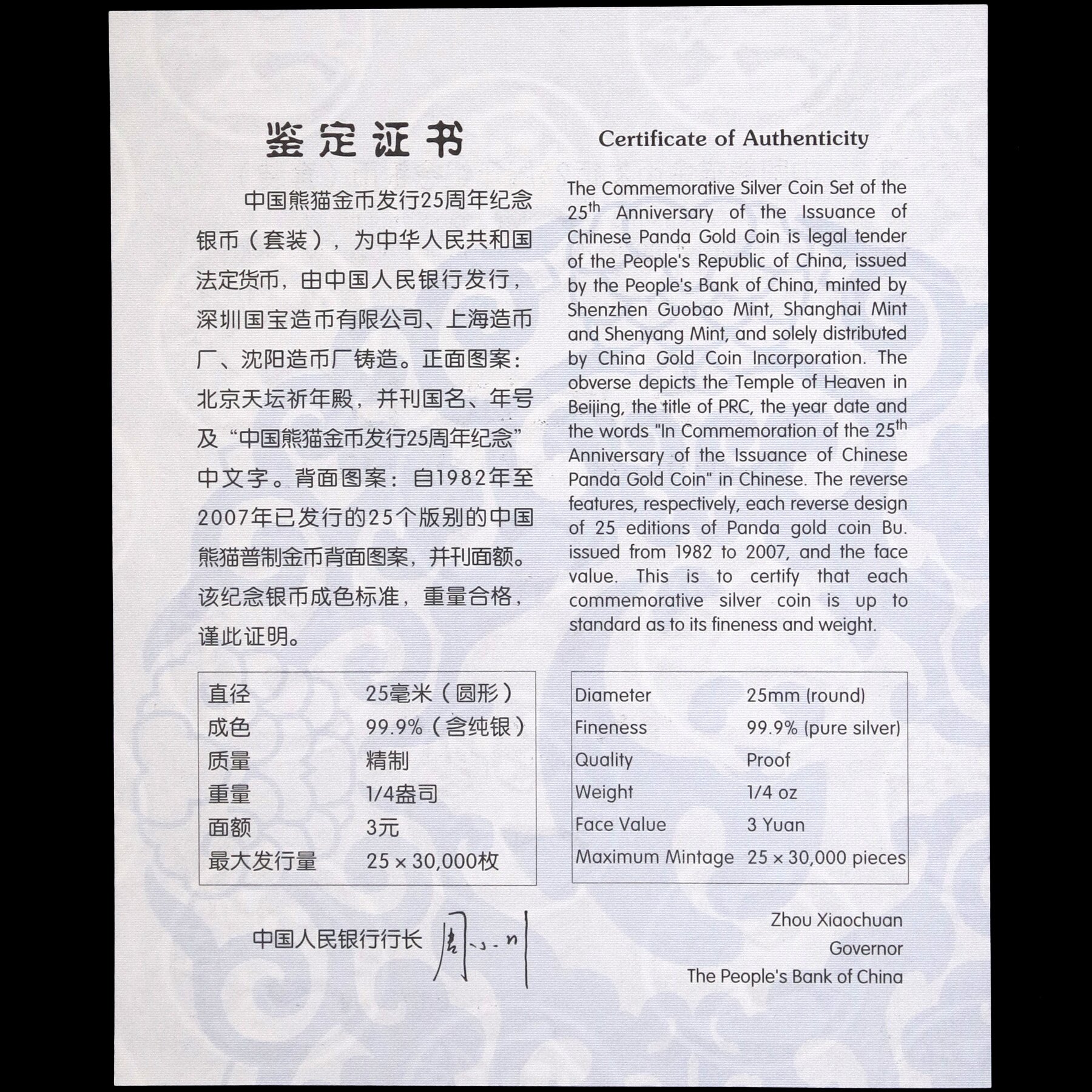 [Новый Баозен] Оригинальный фармацевтический сертификат 2007 1/4 унции Панда Золотая монета Выпуск монеты 25 -й годовщины серебряной монеты