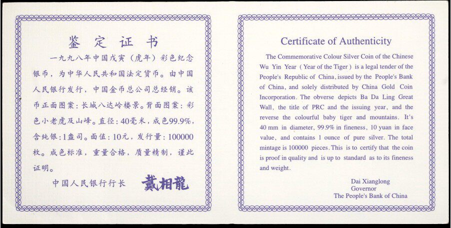 [Ngc rating 69 баллов] Сертификат с сертификатом 1998 года 1 унция тигр год зодиака Цвет Серебряный Цвет Серебряный Тигр