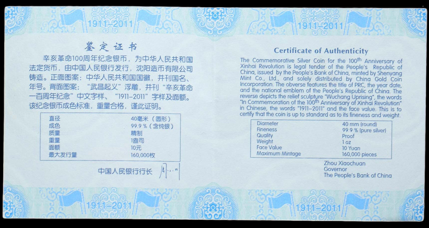 [New Bazhen] Принесите сертификат без коробки 2011 1 унция 100 -летия революции 1911 года.