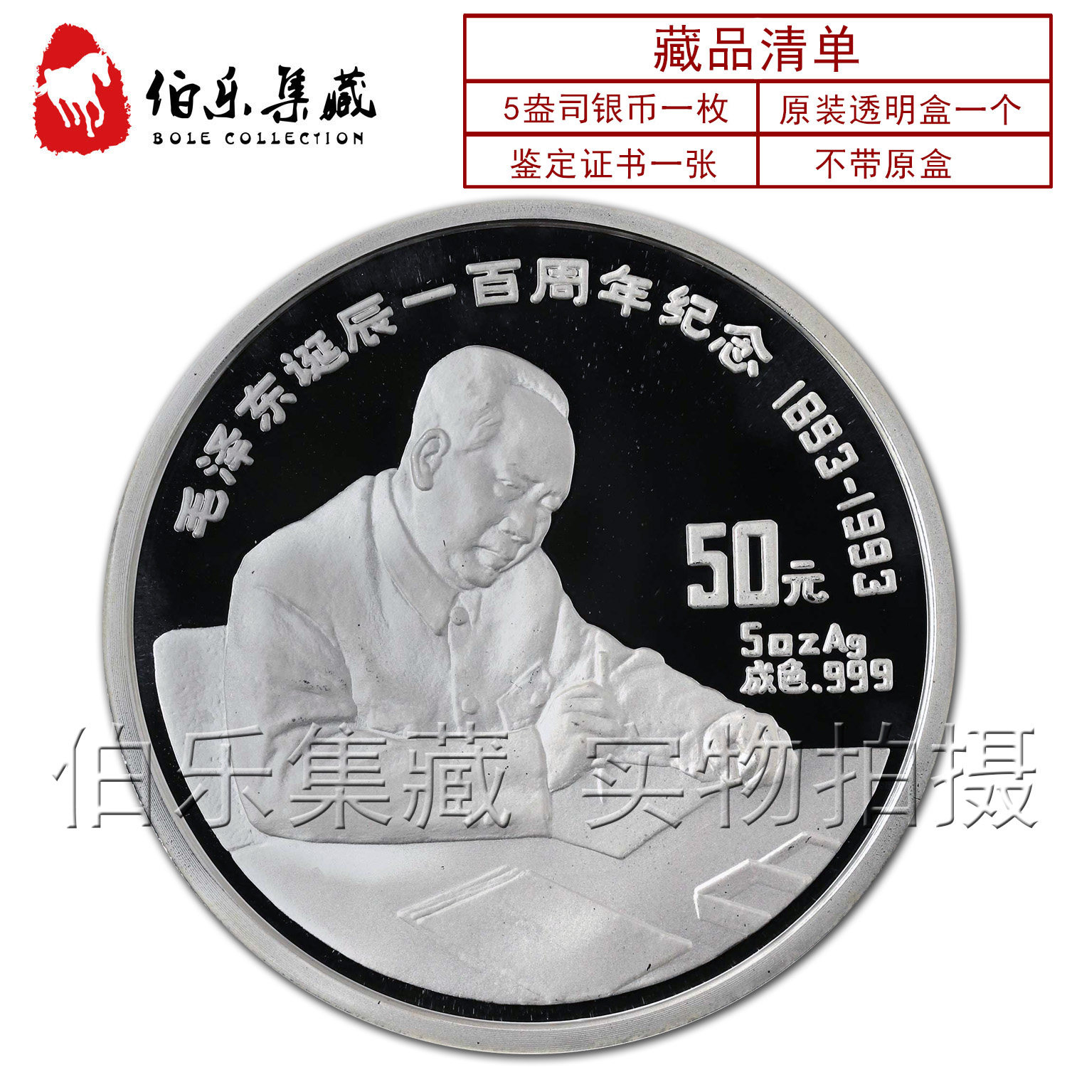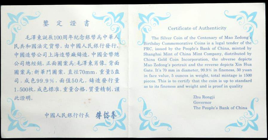 [New Bazhen] Сертификат 5 унций серебряной монеты Mao Zedong в 1993 году Мао Цзэдунга в 1993 году