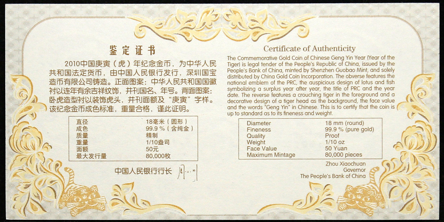 [New Bazhen] Сертификат 1/10 унций в 2010 году с сертификатом в 2010 году