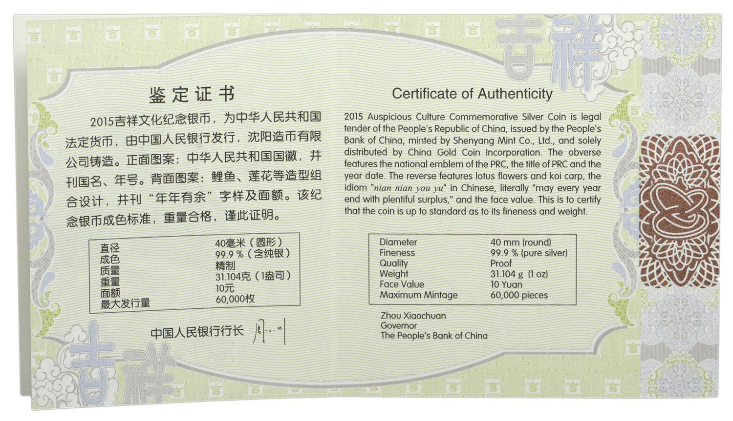 [Новый Баозен] Оригинальный ящик Оригинальный сертификат 2015 1 унция благоприятной культуры имеет более чем более чем праздничные серебряные монеты каждый год
